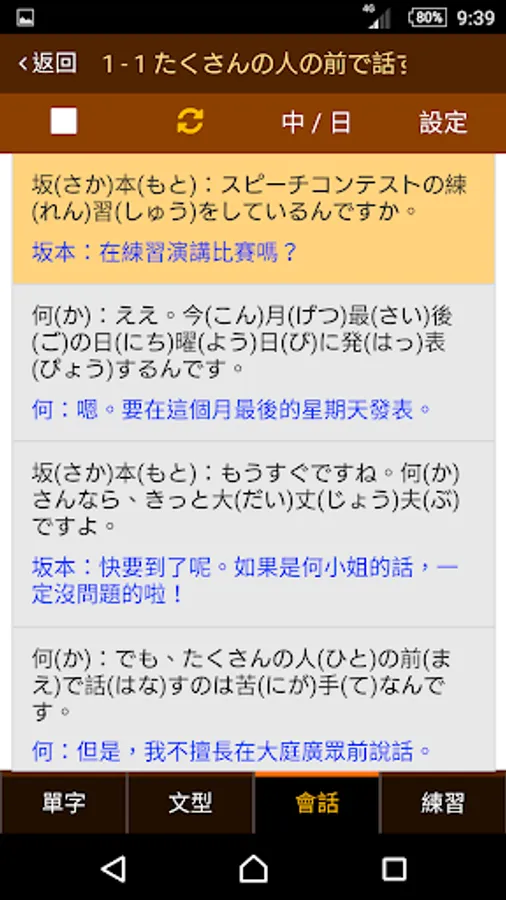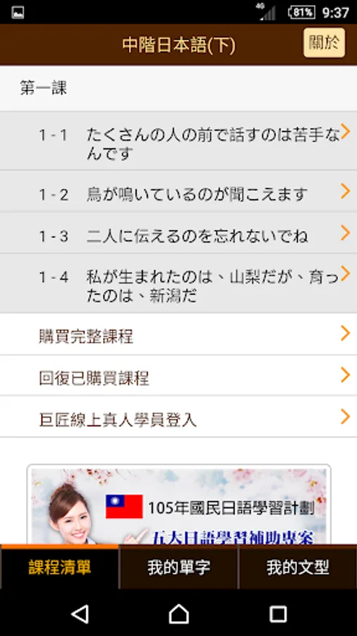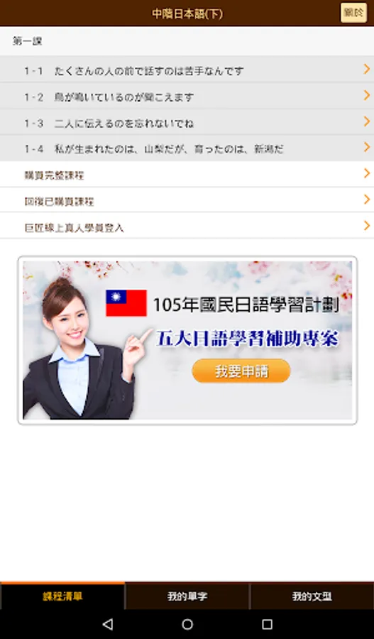 本軟體為【巨匠線上真人】與【和風數位日語】所發行的日語學習教材,讓任何想學習日語的初學者更扎實地學好基礎。全部真人發音,教材內容符合N4檢定考範圍,有效提升您單字記憶、句型應用與會話聽力能力。下載此APP您將可以隨時隨地的學習日語。【巨匠線上真人的日語課程】獨家研發科技化教學課程(含線上家教專業師資、系統化教案、點讀書、APP、數位課程),給您全方位的日語學習規劃。您可立即免費體驗!http://www.abconline.com.tw/activity/abconline/00016/Default.aspx?fromto=99235001