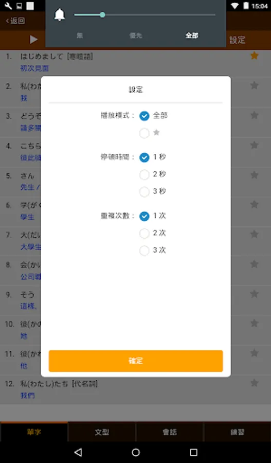 答:APP的音量大小可於課程發音時,使用音量鈕來控制。