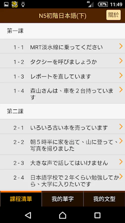 主要分為單字、文型、會話和練習四部分,教材內容符合N5檢定考範圍。