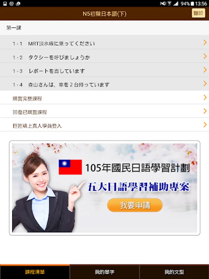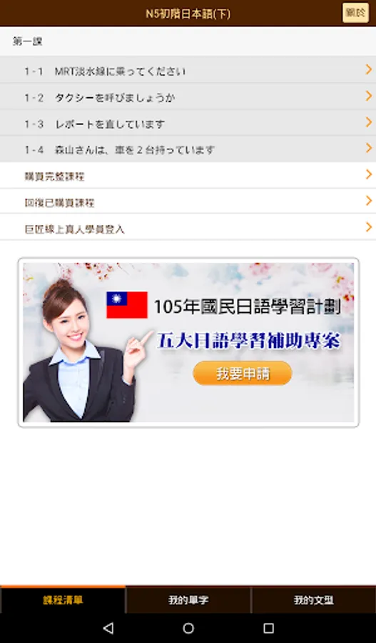 本軟體為【巨匠線上真人】與【和風數位日語】所發行的日語學習教材,讓任何想學習日語的初學者更扎實地學好基礎。全部真人發音,教材內容符合N5檢定考範圍,有效提升您單字記憶、句型應用與會話聽力能力。下載此APP您將可以隨時隨地的學習日語。【巨匠線上真人的日語課程】獨家研發科技化教學課程(含線上家教專業師資、系統化教案、點讀書、APP、數位課程),給您全方位的日語學習規劃。您可立即免費體驗!http://www.abconline.com.tw/activity/abconline/00016/Default.aspx?fromto=99235001