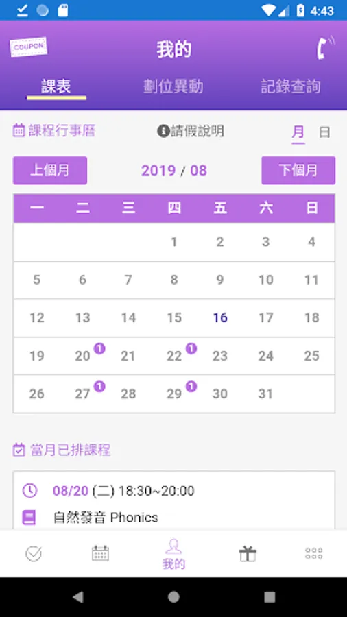 3. 課表:個人專屬課表,按月/按日快速簡單查詢與操作