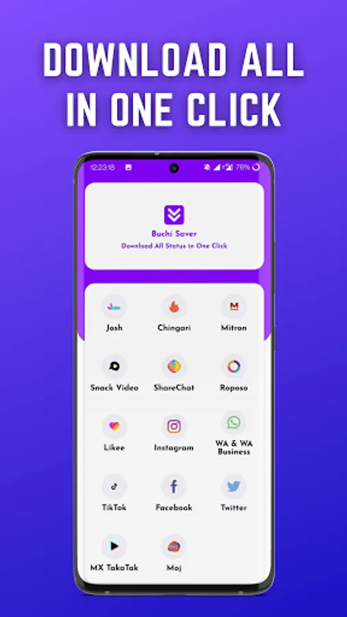 Buchi Saver helps to download all kinds of social media statuses and stories. You can download Images, videos, stories, and statuses from Social Media websites/apps ( Facebook, Instagram, Whatsapp and WA Business, Sharechat, Roposo, Likee, Twitter, TikTok ) without a watermark.