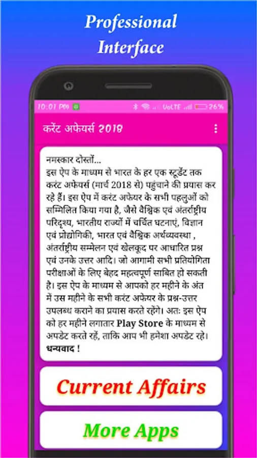 इस ऐप के माध्यम से भारत के हर एक स्टूडेंट तक करंट अफेयर्स (मार्च 2018 से) पहुंचाने की प्रयास कर रहे हैं। इस ऐप में करंट अफेयर के सभी पहलुओं को सम्मिलित किया गया है, जैसे वैश्विक एवं अंतर्राष्ट्रीय परिदृश्य, भारतीय राज्यों में चर्चित घटनाएं, विज्ञान एवं प्रोद्योगिकी, भारत एवं वैश्विक अर्थव्यवस्था , अंतर्राष्ट्रीय सम्मेलन एवं खेलकूद पर आधारित प्रश्न एवं उनके उत्तर आदि। जो आगामी सभी प्रतियोगिता परीक्षाओं के लिए बेहद महत्वपूर्ण साबित हो सकती है। इस ऐप के माध्यम से आपको हर महीने के अंत में उस महीने के सभी करंट अफेयर के प्रश्न-उत्तर उपलब्ध कराने का प्रयास करते रहेंगे। अतः इस ऐप को हर महीने लगातार Play Store के माध्यम से अपडेट करते रहें, ताकि आप भी हमेशा अपडेट रहे।