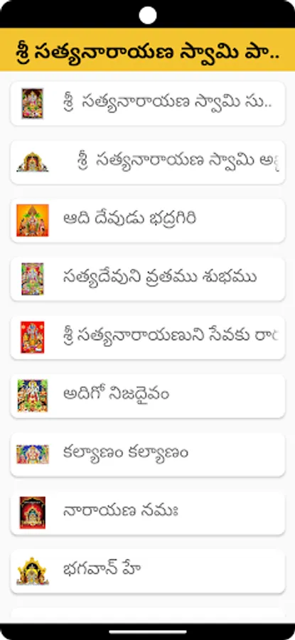 This app "Sri Satyanarayana Swamy songs" contains Sri Satyanarayana Swamy devotional songs in Telugu also known as Sri Satyanarayana Swamy bhakti paatalu in telugu.
