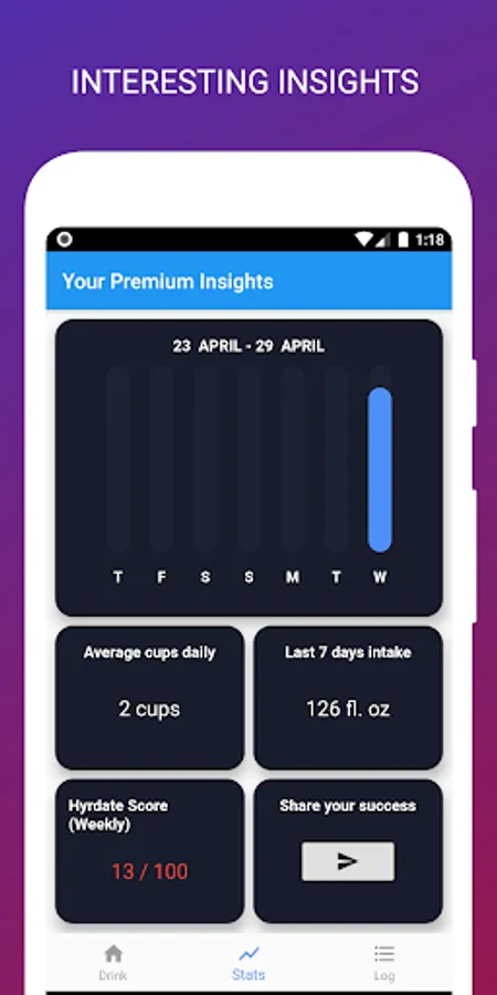 Track your water intake daily and get really useful insights and statistics to track your hydration.