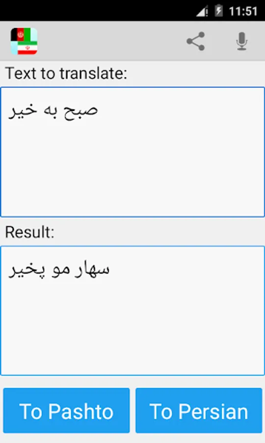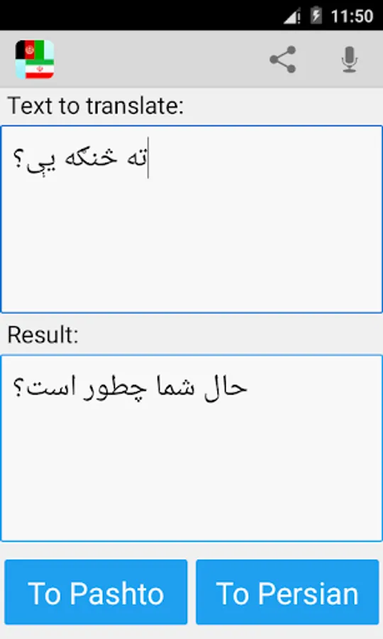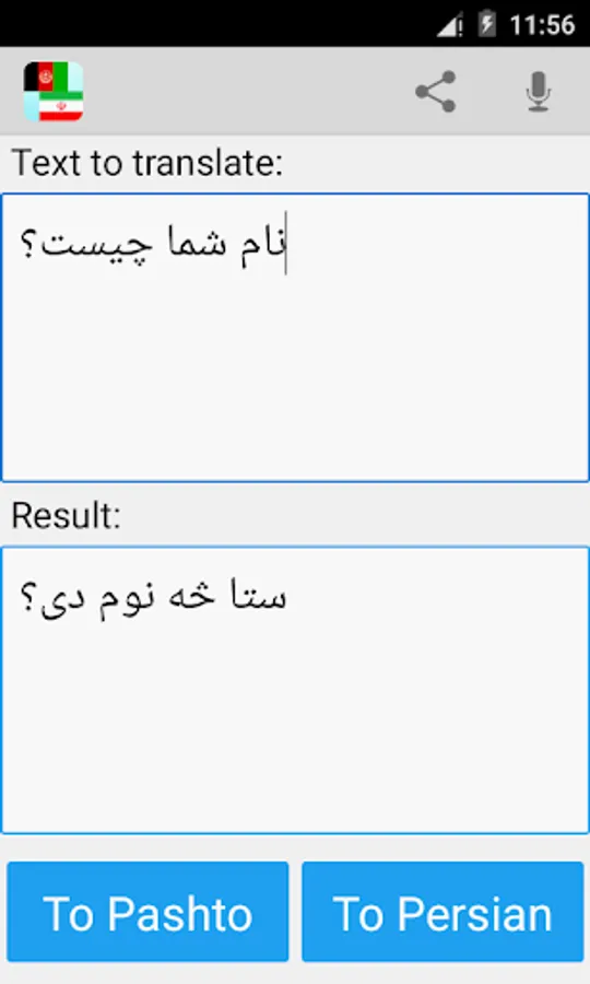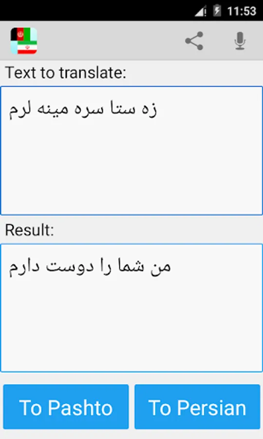 This free app is able to translate words and texts from pashto to persian, and from persian to pashto.