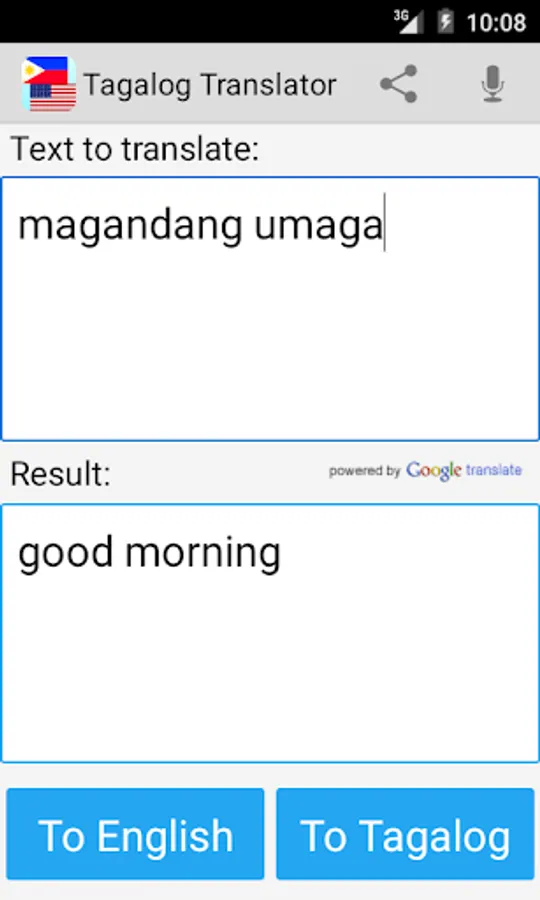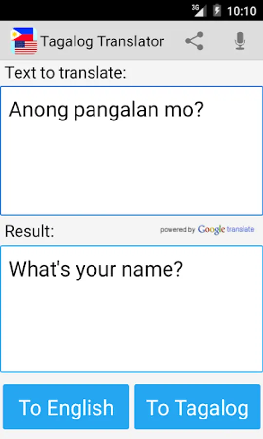 This app is able to translate words and texts from english to tagalog, and from tagalog to english.