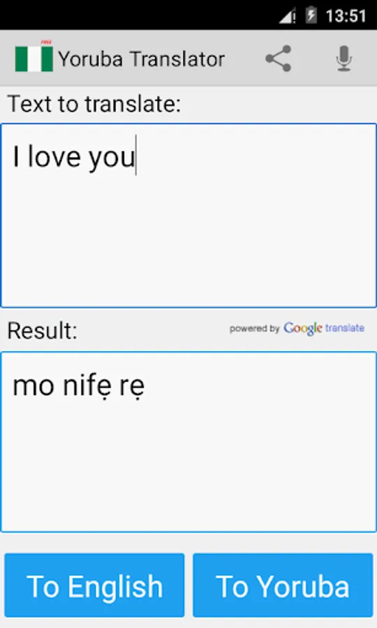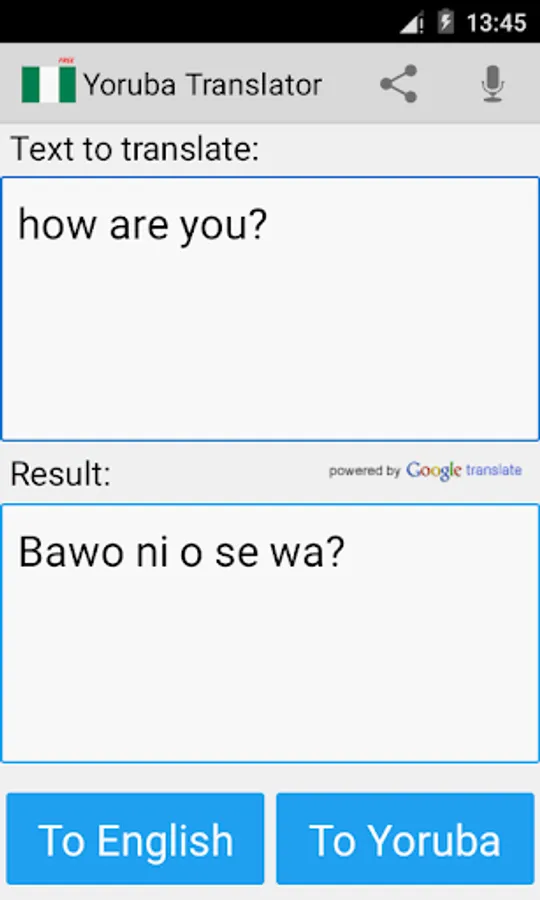 This app is able to translate words and texts from english to yoruba, and from yoruba to english.