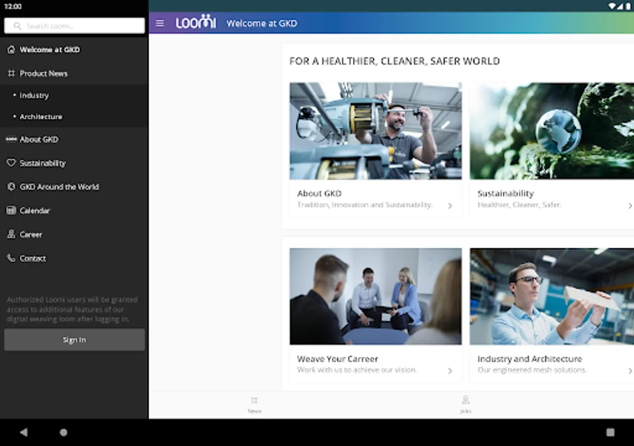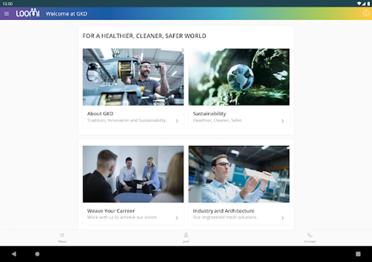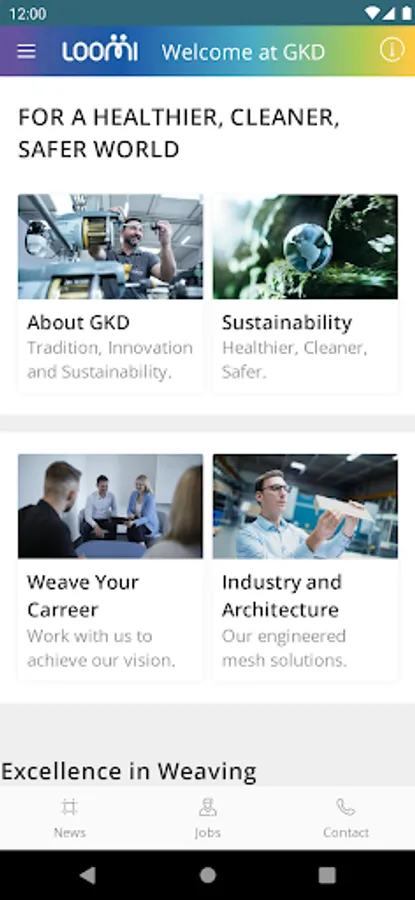 A connecting App. Loomi is the digital loom of the GKD Group and an integral part of an innovative, global production platform. This is where the Living Mesh is woven. In other words, this app offers - for the first time in the history of the GKD Group - all the relevant news, information and interactions within and about the company. Users get access to push notifications, a calendar, as well as location information via Maps and much more. Thus, employees, applicants, customers, partners and other interested parties can find out about GKD's worldwide activities at any time and from anywhere.