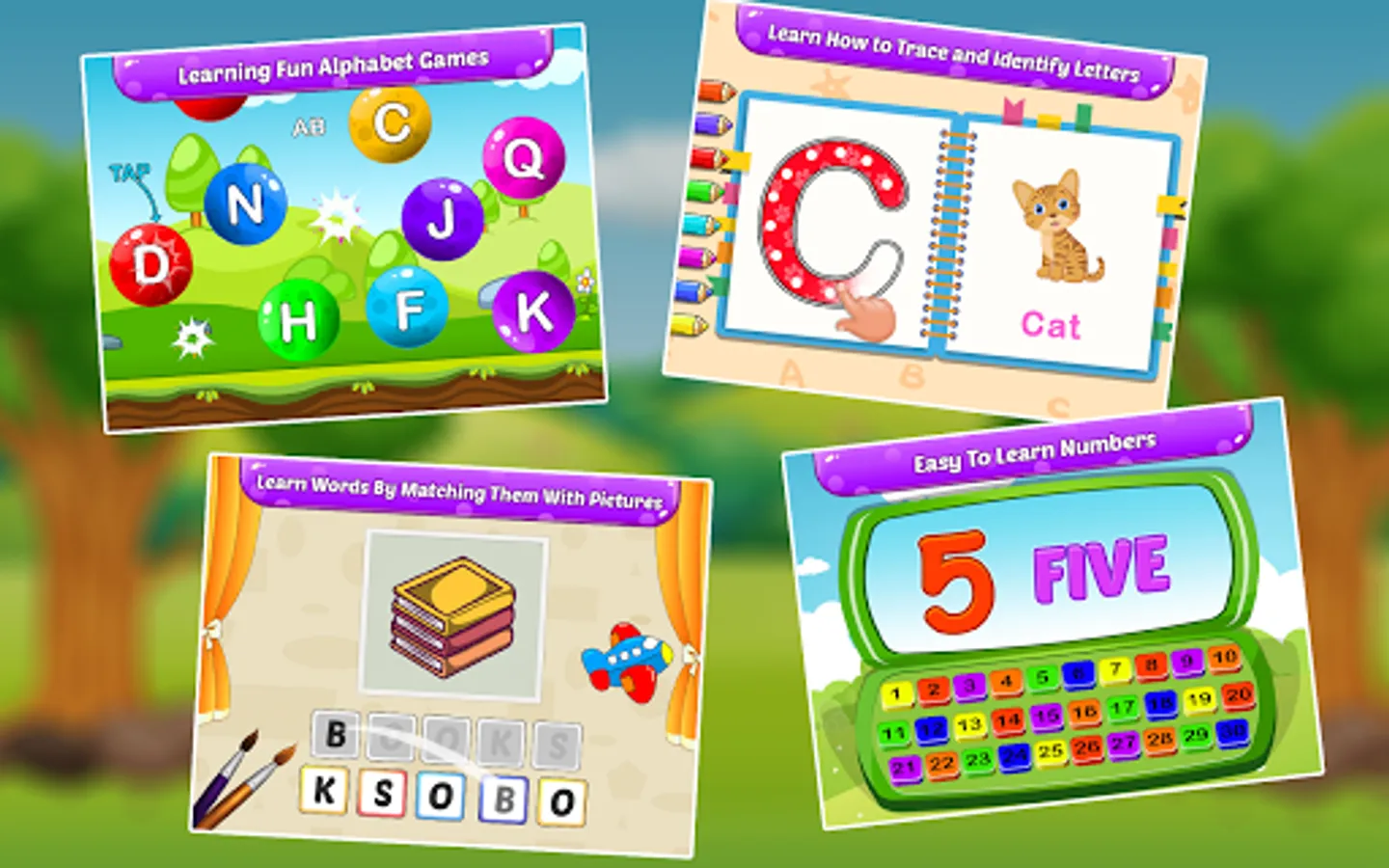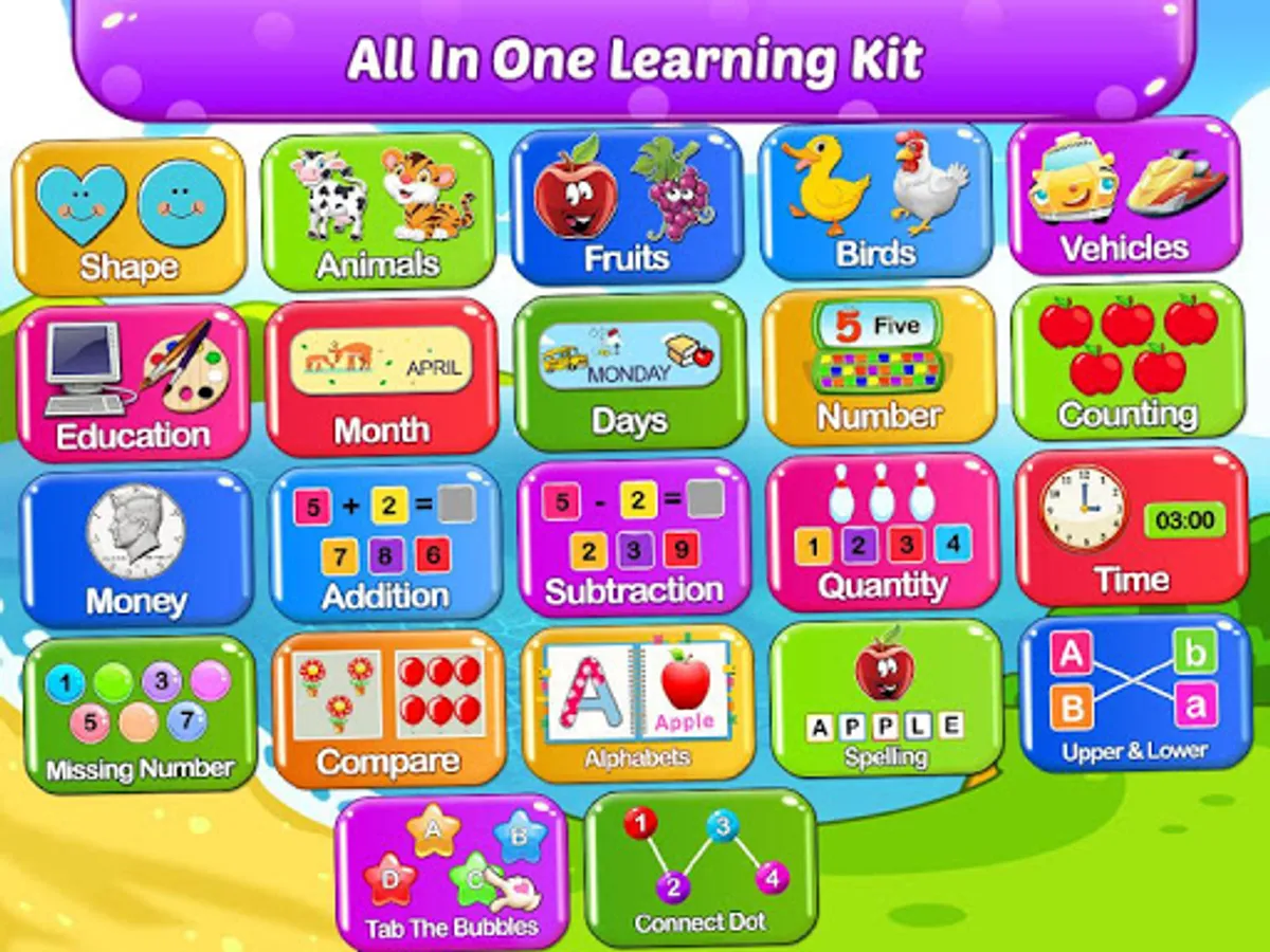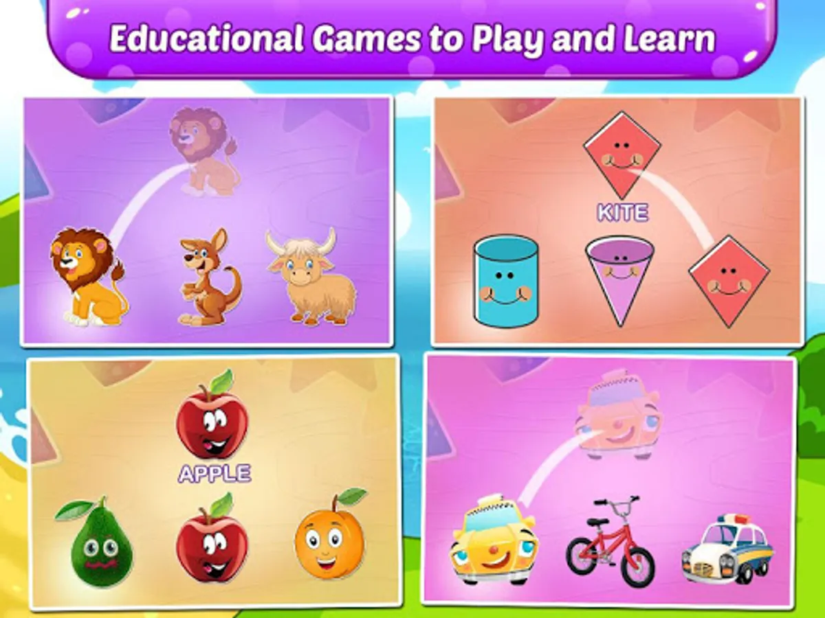 Let them learn ABC in a fun-filled way like never before! Learn to differentiate animals, fruits, birds, vehicles, etc. Play various quizzes to differentiate letters, vegetables, learning including math games for kids for children in a progressively fun manner to lift up preschool children's brain skills and IQ at home.