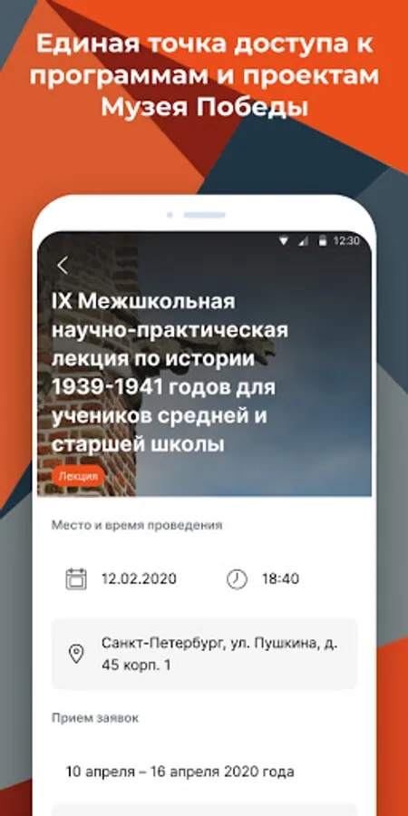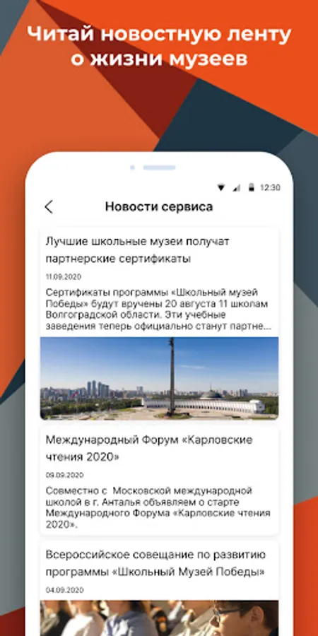 The mobile application is designed to unite on one site school museums - partners of the Victory Museum. Employees will be able to post information about their museums in the application, announce events and share video reports about their events. Schoolchildren (their parents, etc.) will be able to study the content offered by museums and apply for participation in events.