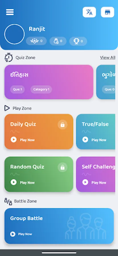 3. Battle Zone : In this quizzes you can play Gujarati GK Quiz with real players. You can battle with single or group players. This Quizzes is base on coins, you can win unlimited coins with your knowledge.
