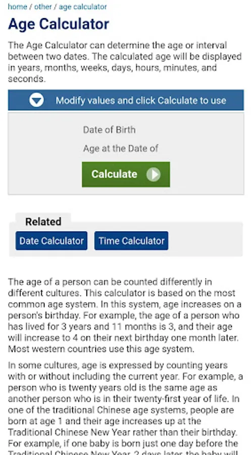 People often ask "how old are you?" and it takes us some amount of mental calculation to reach out to the definite answer. This age app helps in calculating the exact age. All you have to do is enter the accurate date of birth and the result will depict the exact age, next birthday. Also there is special segment in the result category which will depict the exact seconds, minutes, hours, days, weeks, months, years you have lived till now.