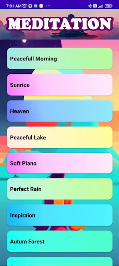 Along with the music there are background relaxation scenes which will serve better atmosphere ranging from Water, Mountains, Tress, Birds, Temple.