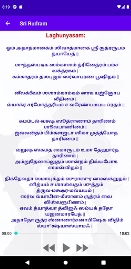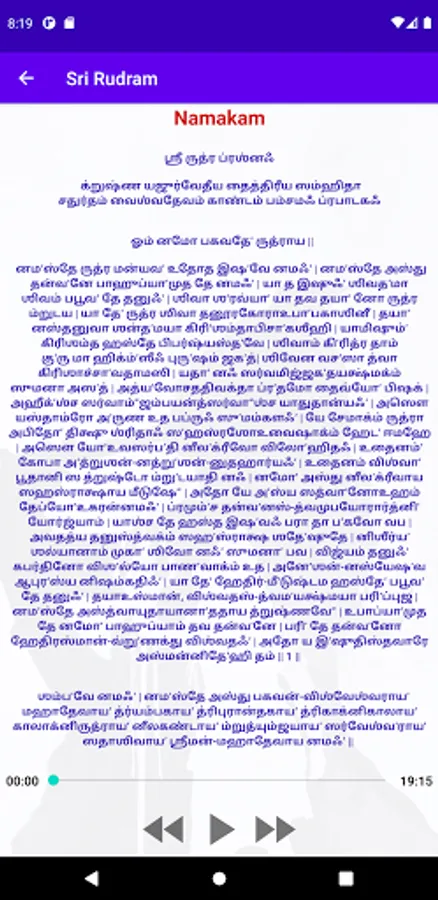 Shri Rudram is a Vedic mantra or chant in homage to Rudra (an epithet of Shiva) taken from the Krishna Yajurveda's Taittiriya Samhita. It comprises two parts, the Namakam and Chamakam. Chamakam is added by scriptural tradition to the Shri Rudram. Shri Rudram is also known as Śri Rudrapraśna, Śatarudrīya and Rudradhyaya.
