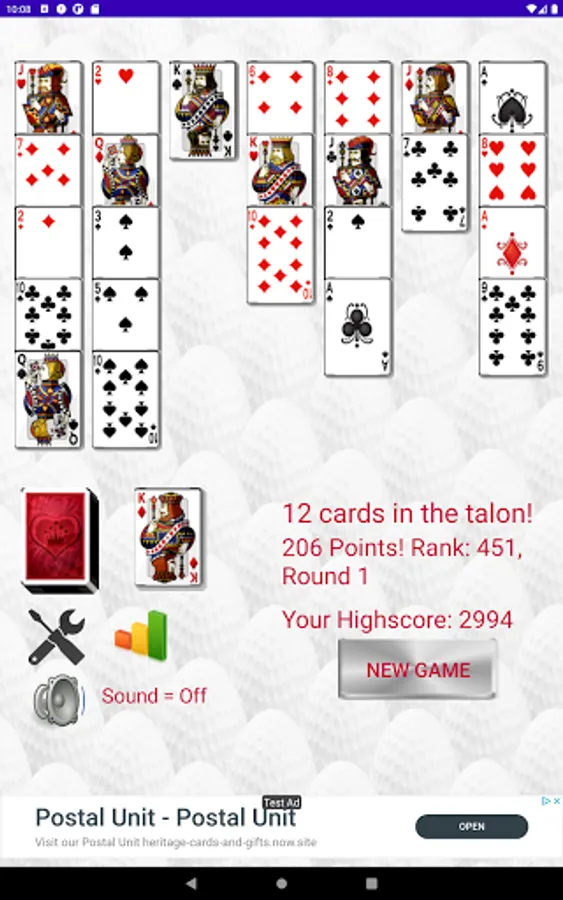 The joker (wild card) can be placed at any time, any card can be placed on the joker. When no more moves are possible, a card from the talon can be placed on the discard pile. The game is over when all cards from the talon are used up and no other moves are possible. When all 35 cards have been placed on the discard pile, a new round begins and the points continue to count.
