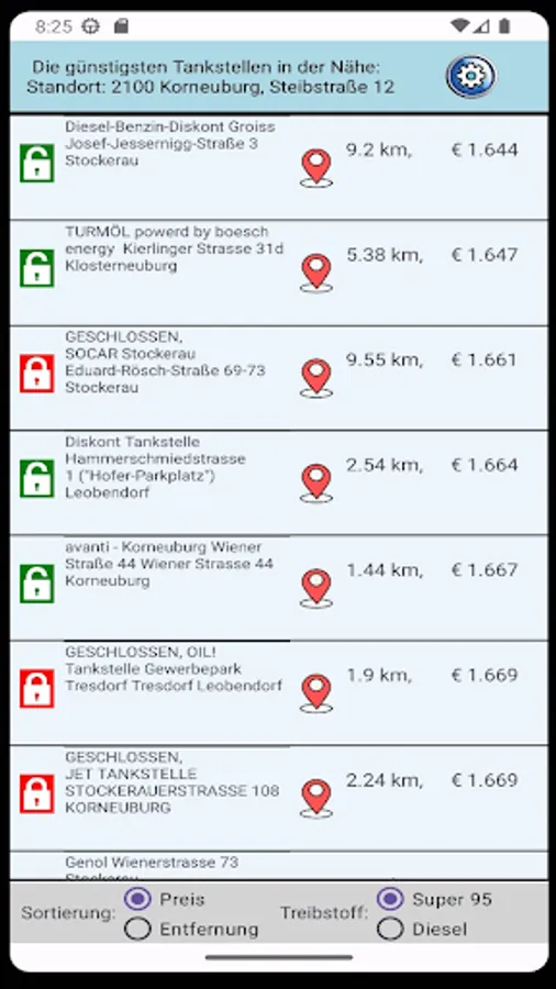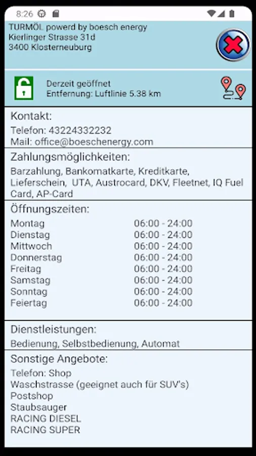 Find the cheapest gas station within a radius of 5, 10 or 20 km with all detailed information such as price, distance, opening hours, shop offers and payment options.