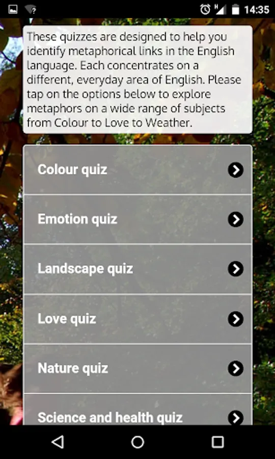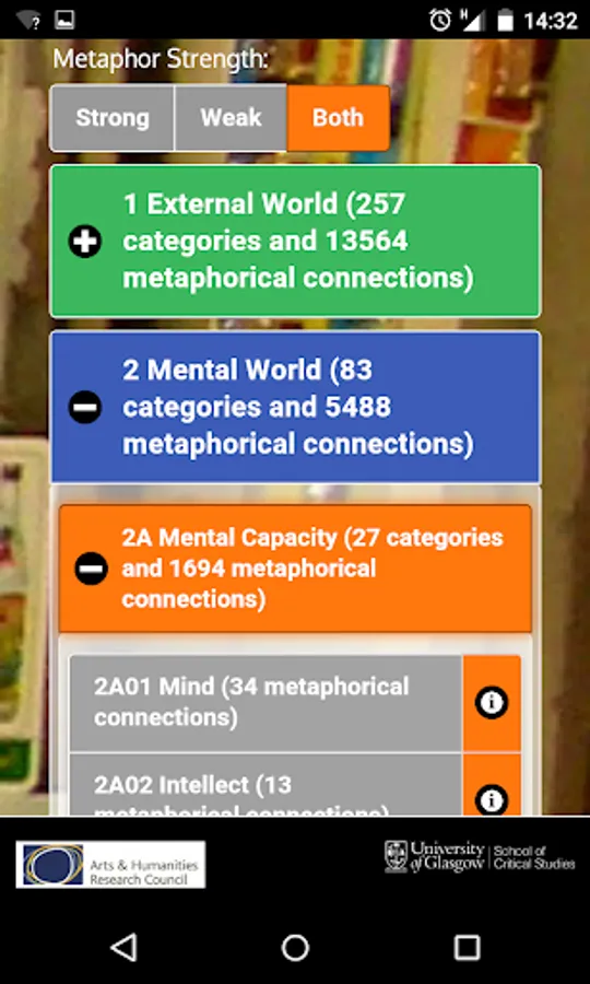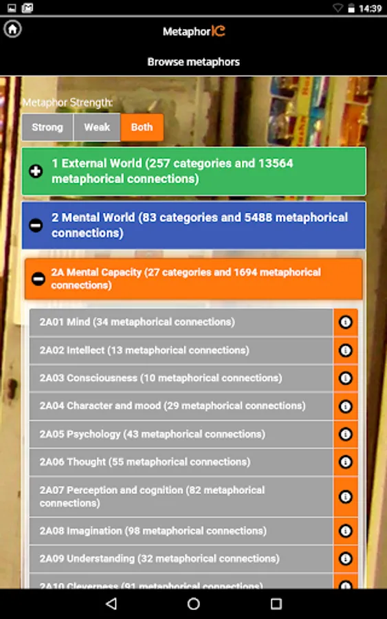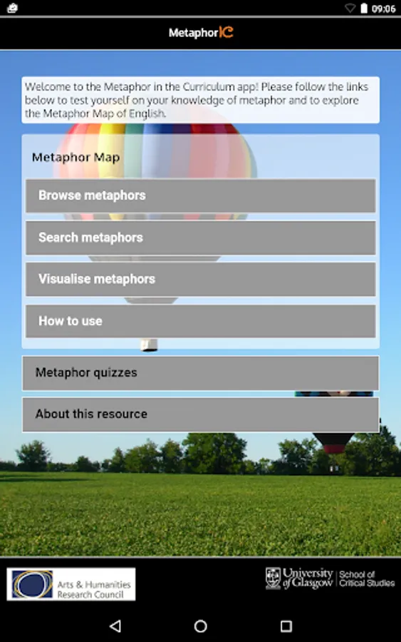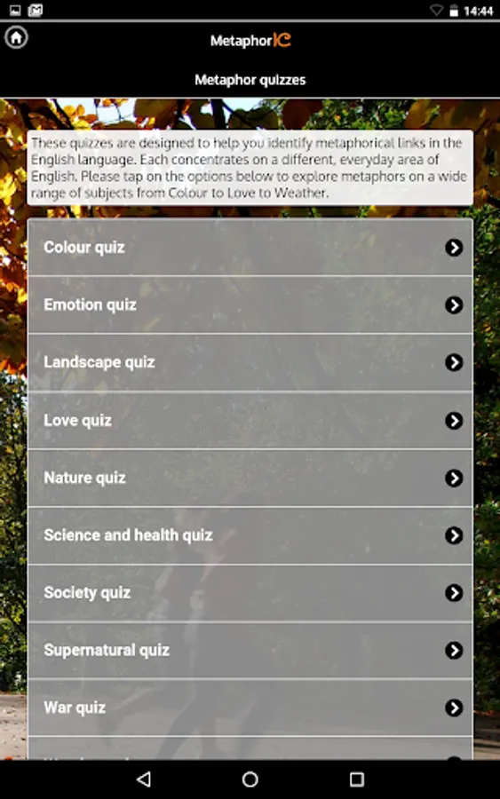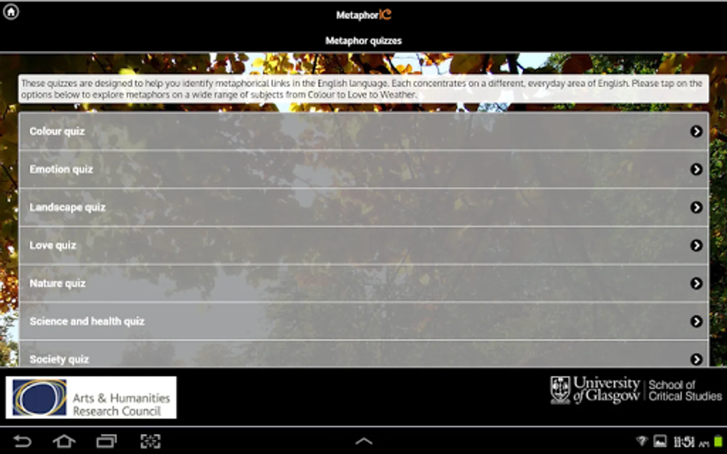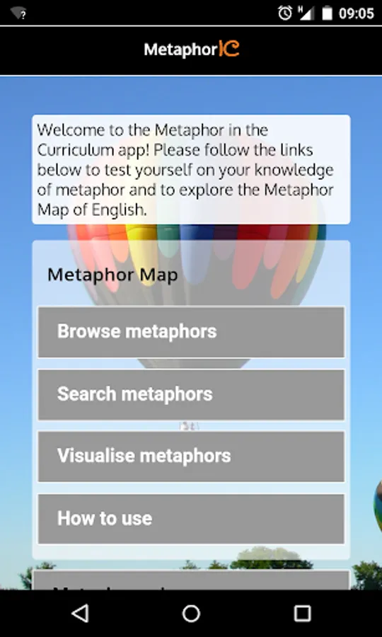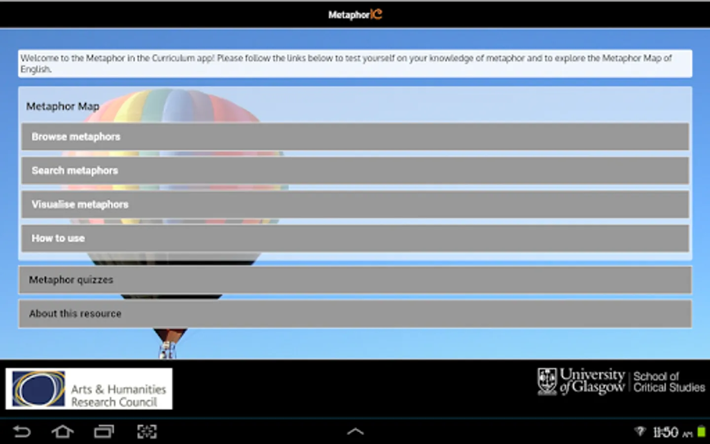 The ‘Metaphor in the Curriculum’ app provides interactive tools to help to increase your knowledge of metaphor in the English language. There are two major components to the app: metaphor quizzes and a version of the Metaphor Map of English. The app can be used alongside the Metaphor in the Curriculum website, which contains teaching materials for secondary schools and online access to the features of the app.