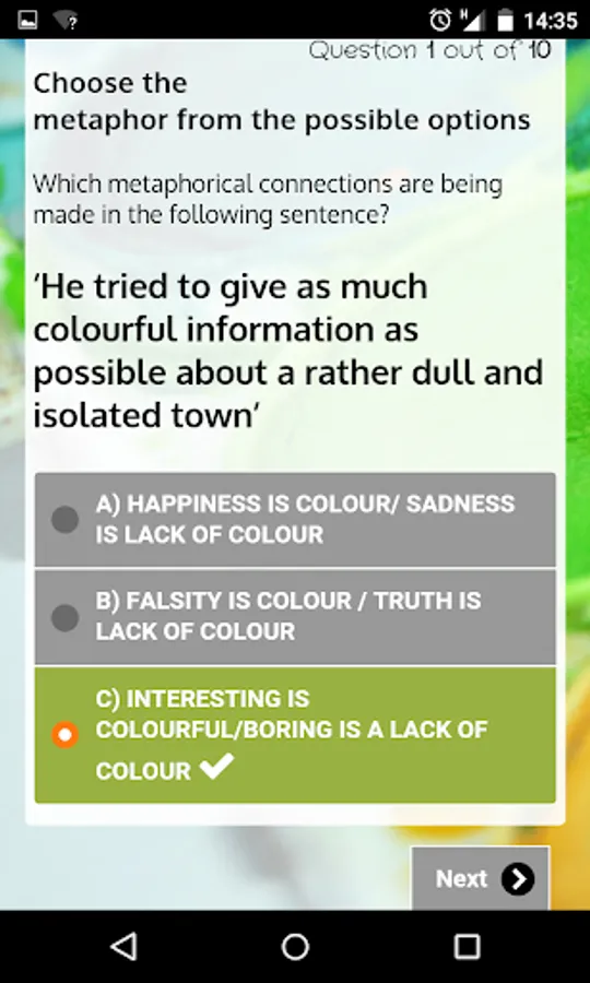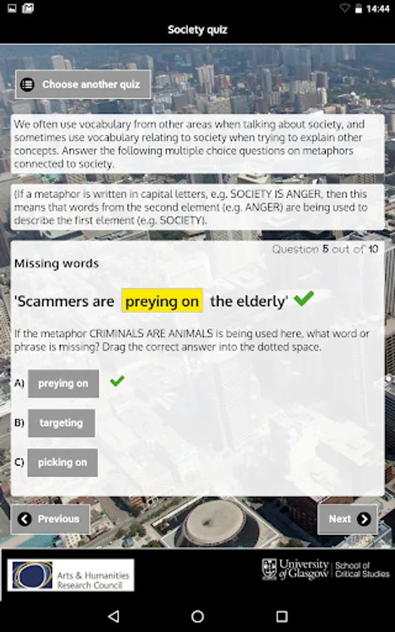 The metaphor quizzes are designed to help users to recognise and understand the mental connections that are being made when we use metaphors. They ask the user to identify the area of meaning that the metaphorical word has come from, and the area of meaning to which that vocabulary has been transferred (e.g. ‘a bright child’ uses the word bright, which has been transferred from the area of LIGHT into the area of INTELLIGENCE).
