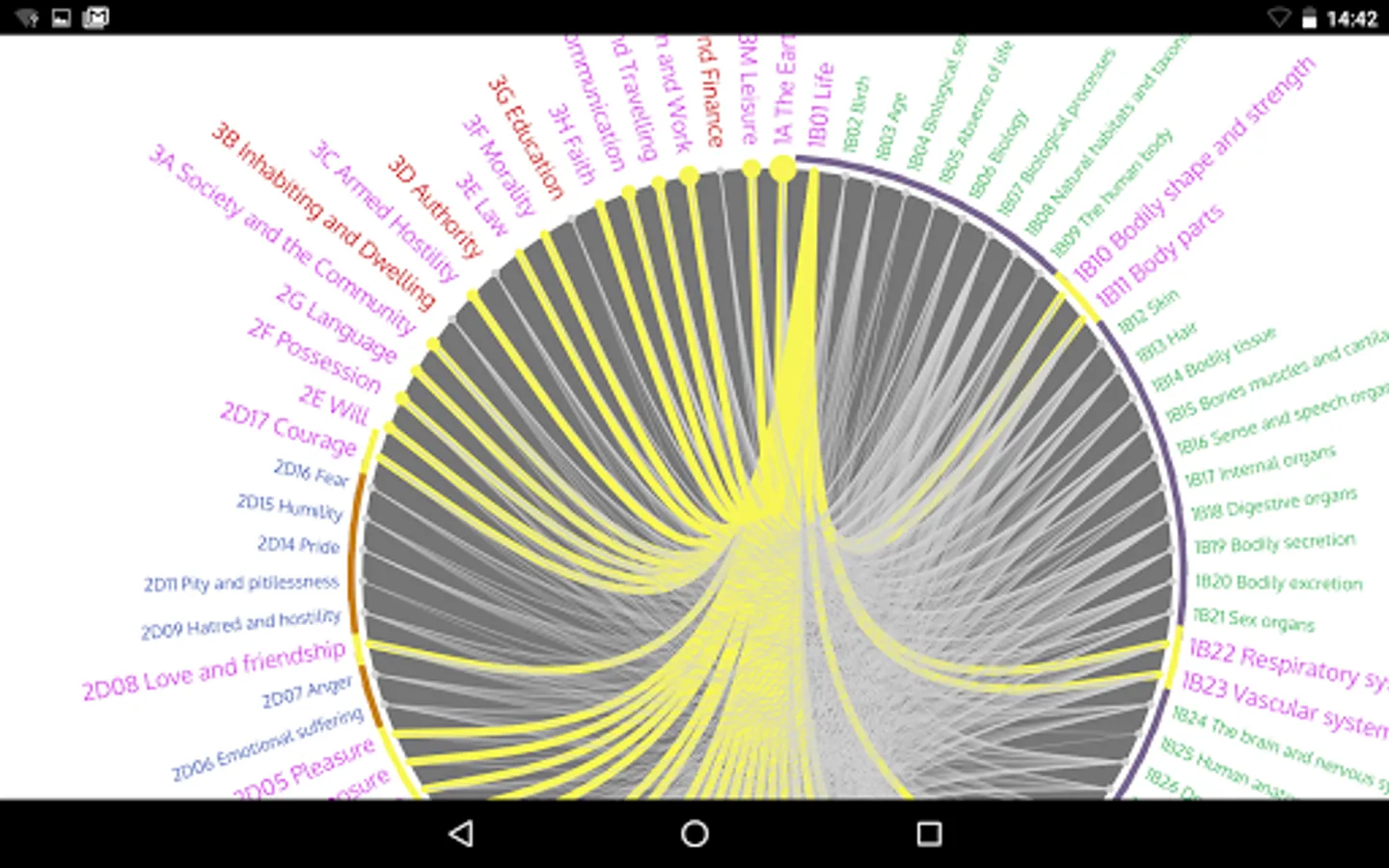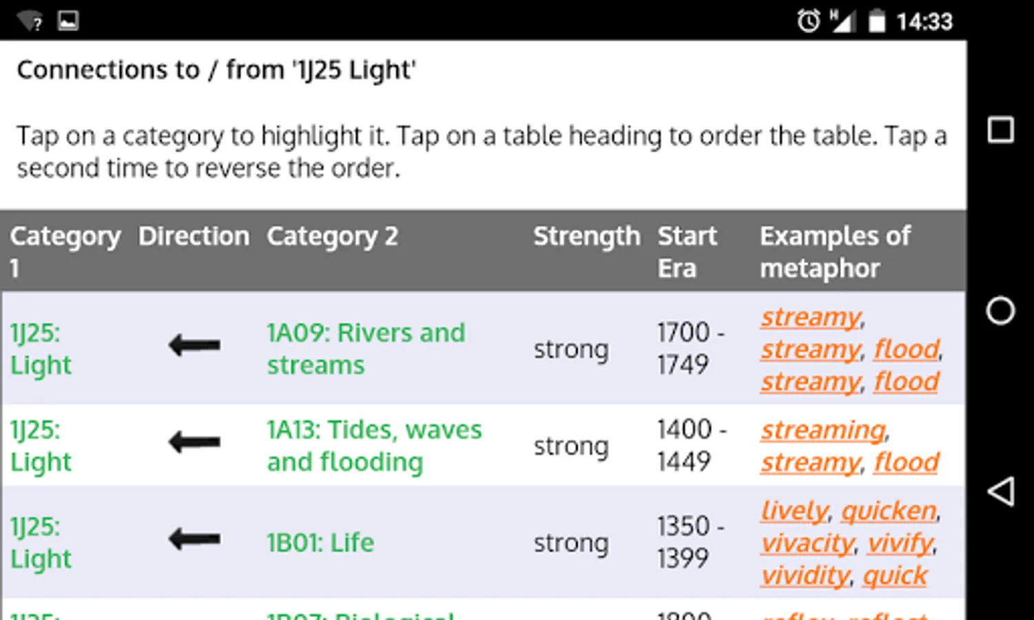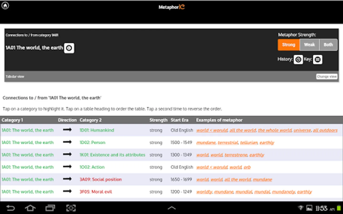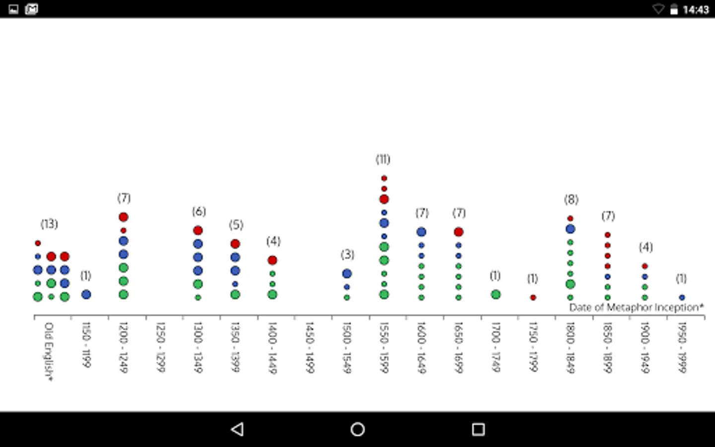 The Metaphor Map of English shows the metaphorical links which have been identified between different areas of meaning. These links can be accessed through three different tools: browse, search or the Metaphor Map visualisation. They can be viewed as tables, metaphor cards, visual links or timelines. The metaphorical links can be from the Anglo-Saxon period right up to the present day so the map covers 1300 years of the English language. This allows us to track metaphorical ways of thinking and expressing ourselves over more than a millennium.