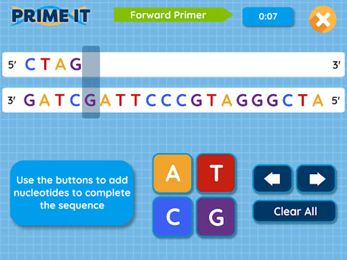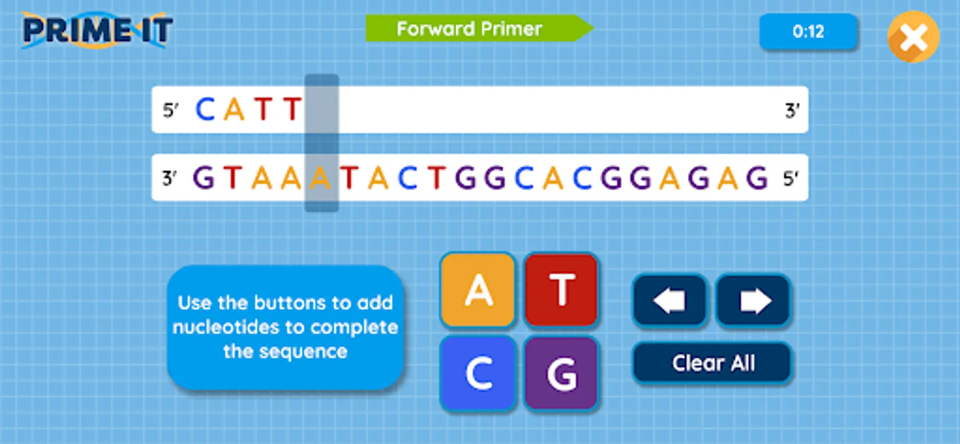Undertaking a molecular course as part of your education? This game is aimed at students with knowledge of DNA and undertaking a molecular course. It was designed by a University of Glasgow undergraduate student and aims to help with your understanding of PCR primer design. Speed and accuracy are required to get a good score!