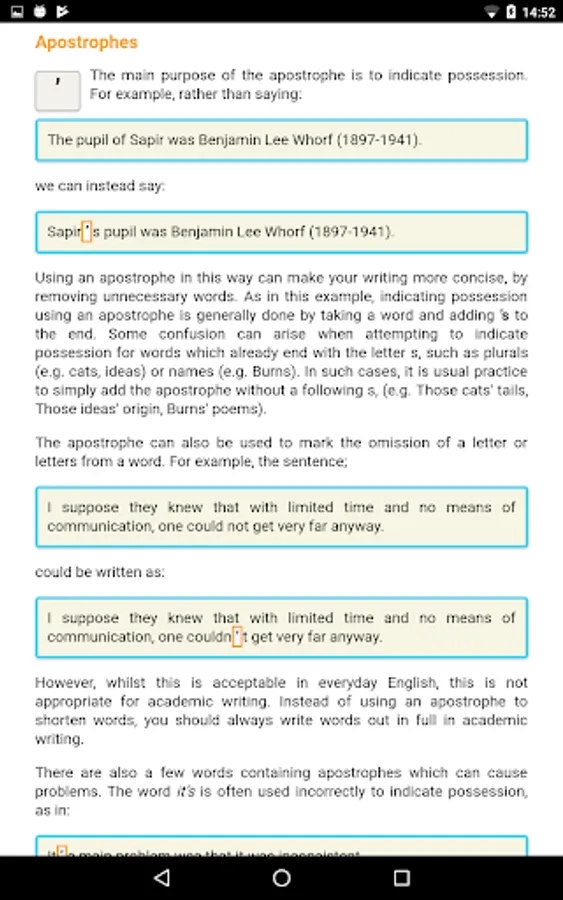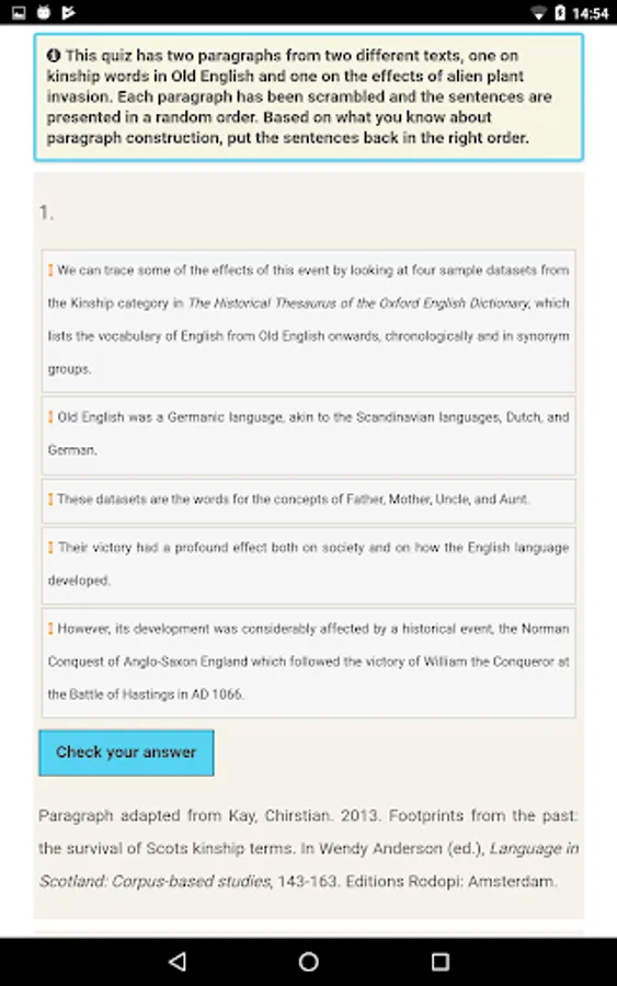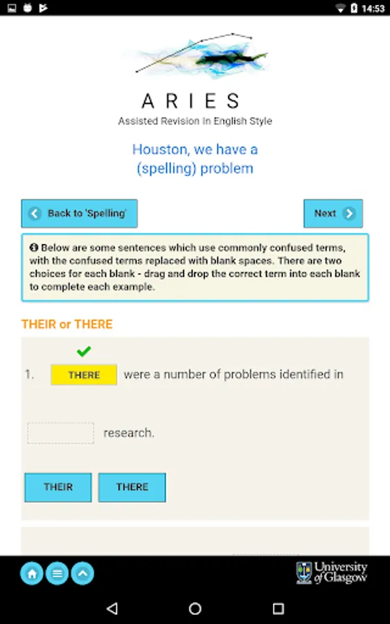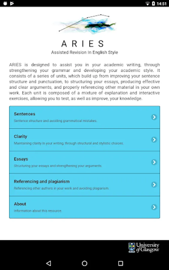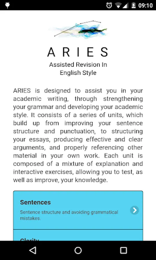 ARIES (Assisted Revision In English Style) is designed to assist you in your academic writing, through strengthening your grammar and developing your academic style. It consists of a series of units, which build up from improving your sentence structure and punctuation, to structuring your essays, producing effective and clear arguments, and properly referencing other material in your own work. Each unit is composed of a mixture of explanation and interactive exercises, allowing you to test, as well as improve, your knowledge.