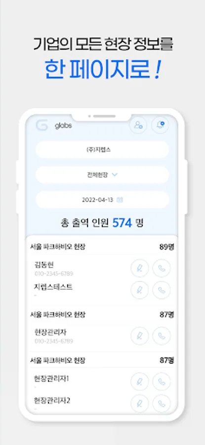 10. View contact information: The head office manager can register and inquire the contact information of the person in charge for each site and contact them directly, and field workers can also contact the site manager directly through the contact information of the site manager