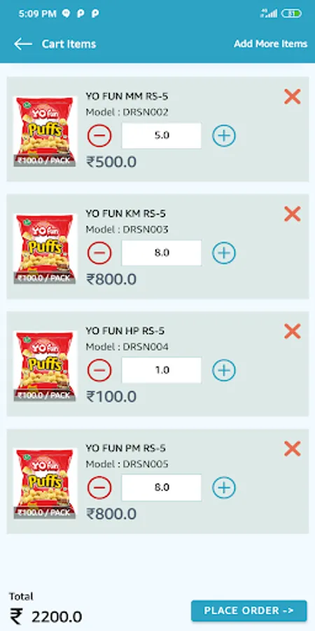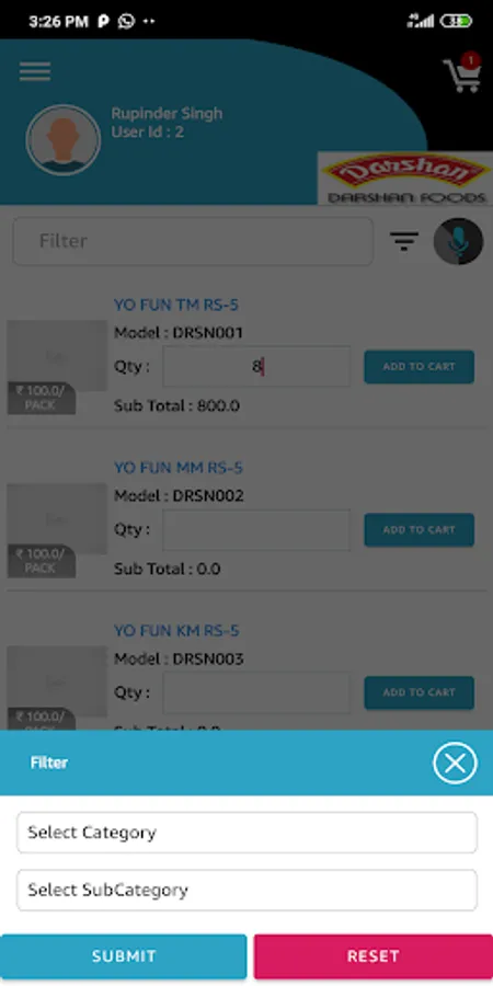 The application includes detailed listings of All Products with price, Place Order and view orders, collections and various other functions.