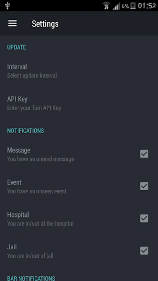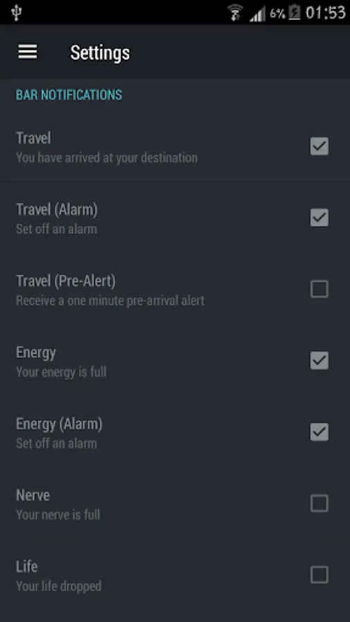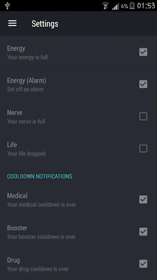 - Notifications (Travel, Energy, Nerve, Happy, Life, Cooldowns, Hospital, Jail, Message, Event)