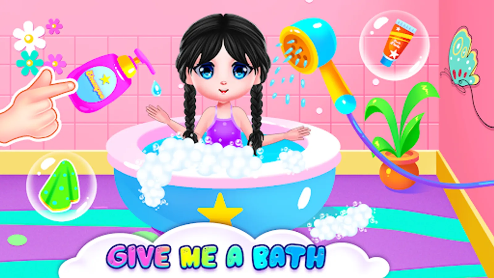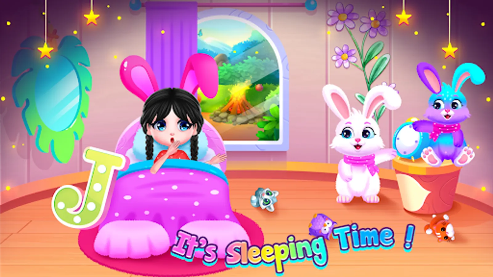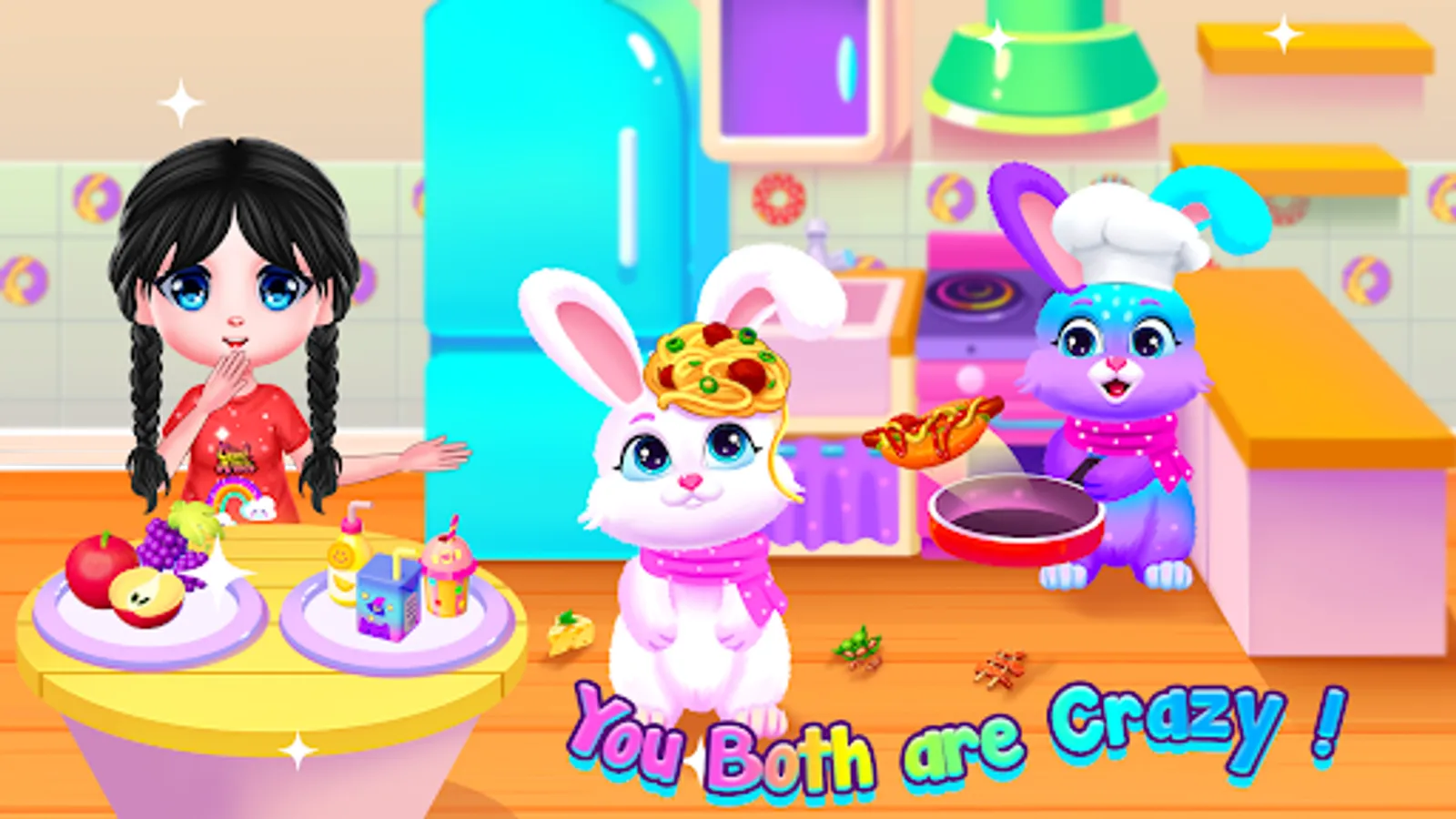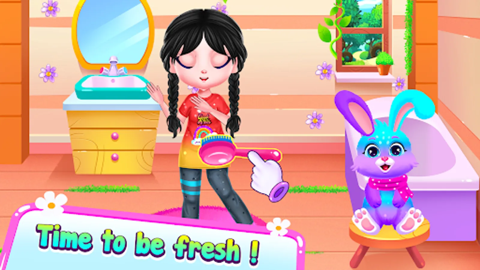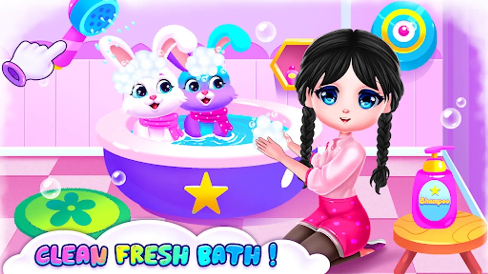 A cute anime girl and her pets await you and want to be your best friends. Play this amazing game and help our girl take care of herself and her adorable bunnies. Start by going into the kitchen. There you will be shown a ton of delicious treats such as fruits, pancakes, fries, cupcakes and so much more. Do not forget to feed the bunnies as well. Everyone is so dirty a trip to the bathroom is needed. Fill up the tub with water and give a bath to this lovely anime girl. Use the available tools: soap for cleaning her body and shampoo for her head. Rinse her hair carefully, then use the green towel to make sure she is completely dry. Help this girl clean her teeth by using a toothbrush and toothpaste. Now that our character is all cleaned up make sure to bath the bunnies as well. Apply a small amount of shampoo, lather it until bubbles form, rinse it out with warm water, and pat them dry with the towel. Go to the playroom alongside your new friends. Play exciting games and have fun: we have prepared a pool filled with little colorful balls just for your enjoyment. Put on some music and get the party started. An important aspect is that you can customize the character to your liking. We encourage you to try out new and bold hairstyles, outifits and even accessories. Often shoes can make or break an outfit so be careful in choosing the right pair. Using hairspray is a big step when it comes to making sure hair stays in place so spray a generous amount. Do not forget to check out the premium features that are included in this game. Do so by pressing the “dress premium” icon. You had so much fun today, but now everyone is starting to get sleepy. Next, go to the bedroom area. Tuck everybody in their beads and let them rest. All your new friends are so excited to play with you again when they will be waking up.