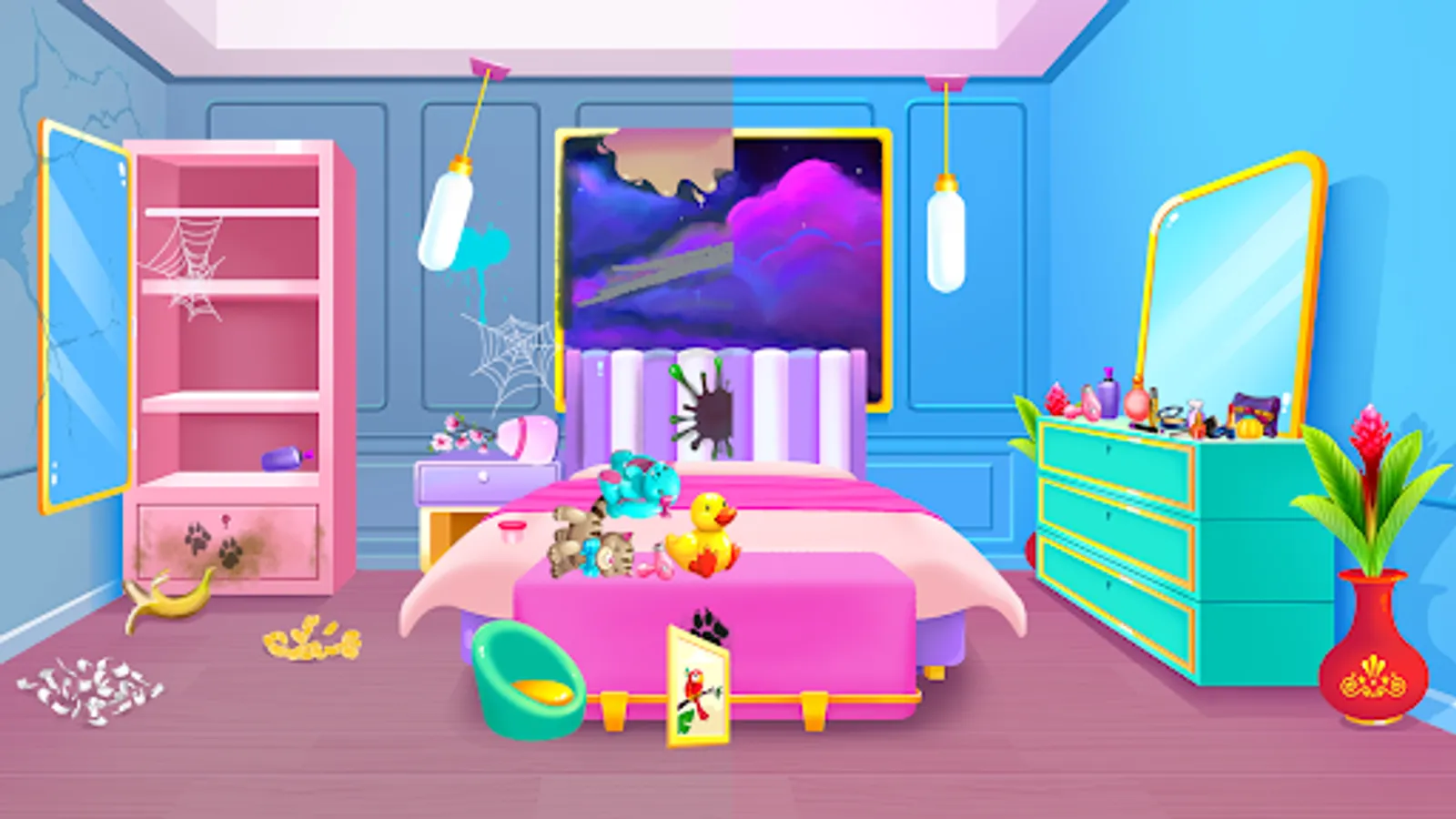 This awesome game will show you how to properly clean a cozy family-friendly hotel. Take a look around and be ready to work your magic. Prepare the rooms so when guests arrive they will be satisfied with the results. The bedroom looks horrendous, let’s start there. Pick up the sponge to wipe the mirror that is hanging on the left wall. Carefully remove the spider webs that are all over the place and scrub the walls until they look like they are brand-new. Let’s move on to the bathroom. It looks even worse than the other room we just cleaned! There are germs on the toilet and the bathroom tub; the mold and dust are spreading everywhere. Put disinfectant on the WC and the tub and let it sit there, but not for long. After a few moments scrub off the solution. Next on our list is the kitchen which is in pretty bad shape. Sweep the floor and remove all of the rotten food, stains, and dirt that is on the countertops. Throw away the spoiled items in the fridge and deep-clean them. Oh no! A dog left its paw prints everywhere and you need to get rid of them immediately. Apply soap and don’t forget to wash them off. Now that you have tidied up the kitchen let’s bake some delicious treats. Prepare the dough by dividing it with the help of some star-shaped cookie cutters. Place them in the oven and let them sit there for some time. Do not forget about them though! When you will enter the dressing room you will find a mess. Clean and declutter the room, in the same manner, you did with the others, and do not forget to use all available tools at your disposal to make this hotel spotless. Finally, the guests arrive. One of the guests needs your assistance in picking out an outfit from the many choices she has. Give her advice and let her know that accessories are trendy right now. Choose a pair of heels for a more chic look.