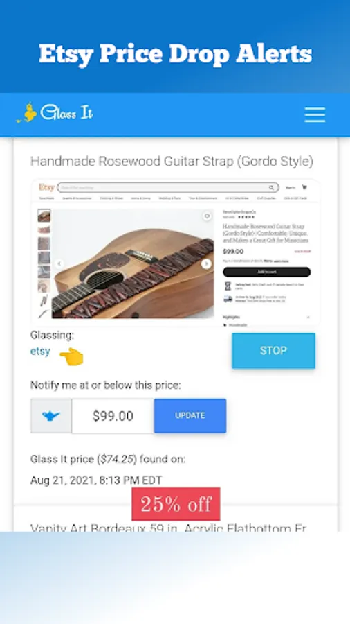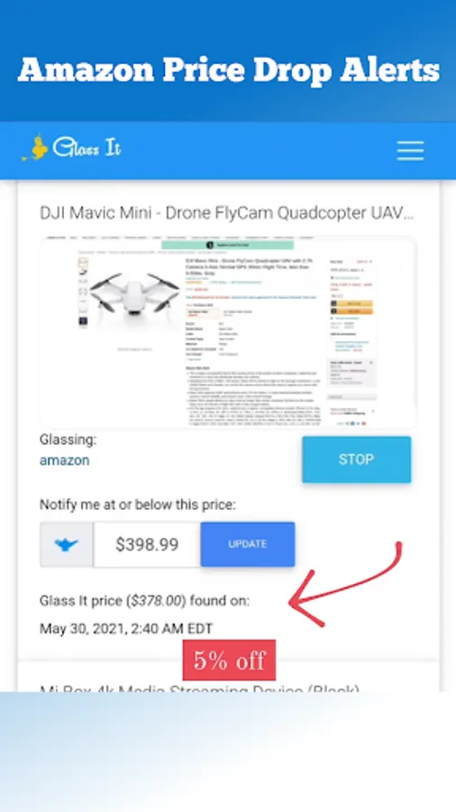 Track Amazon prices for discounts, but don't forget other websites might sell the same item(s)! Glass It Price Tracker sends you suggestions for other vendors that sell your item(s) if you have enabled push notifications