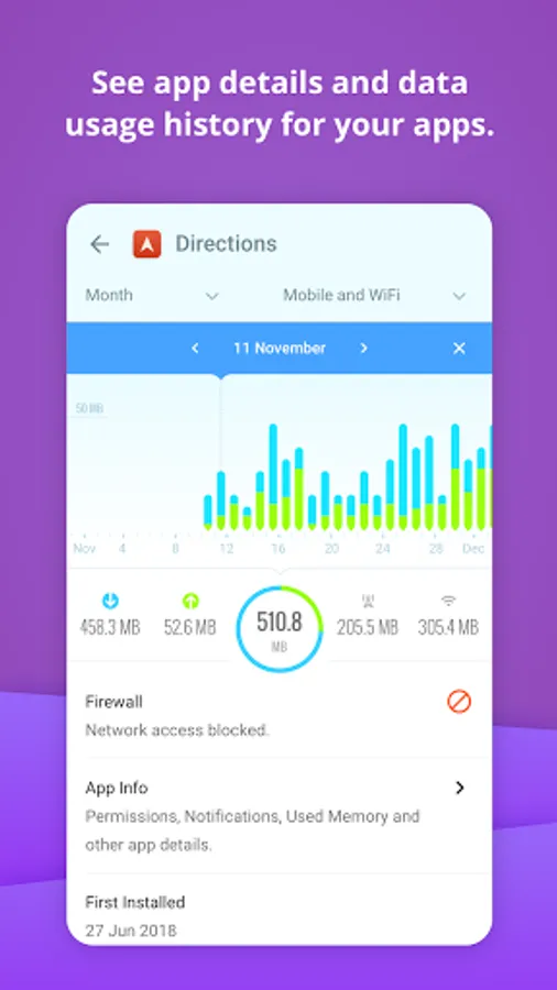 • Instantly know every time a new app accesses the network and begins using Wi-Fi or mobile data.