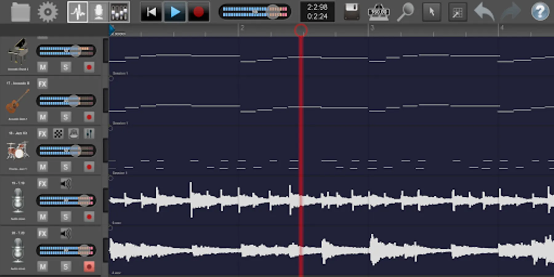 · Sample editor: copy/paste, split, loop, fade-in/fade-out, normalize each audio recording session