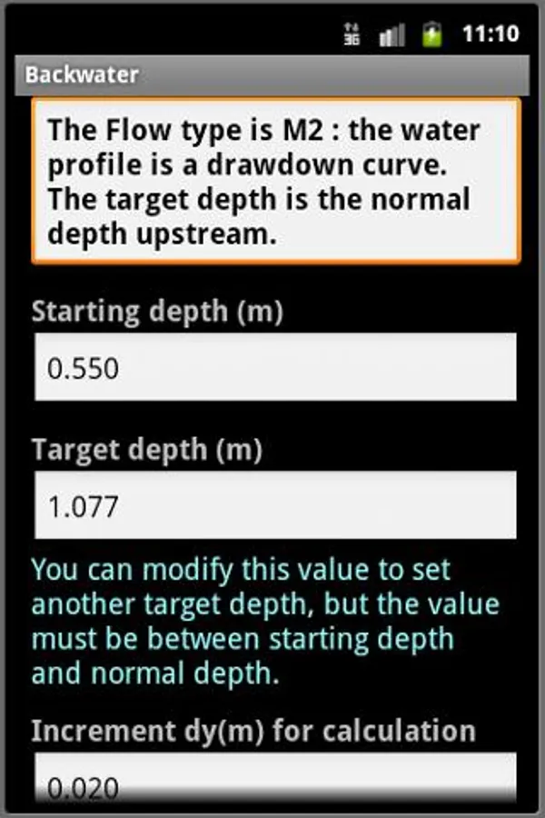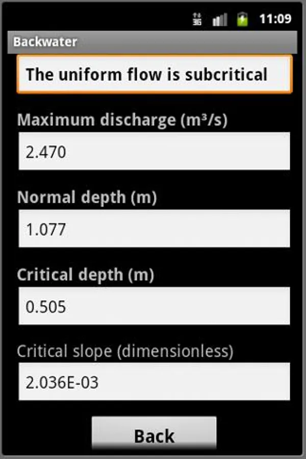 Backwater provides : normal depth, critical depth, critical slope, maximum discharge, the flow type (M1, M2...)... and the coordinates of the water profile on the considered reach.