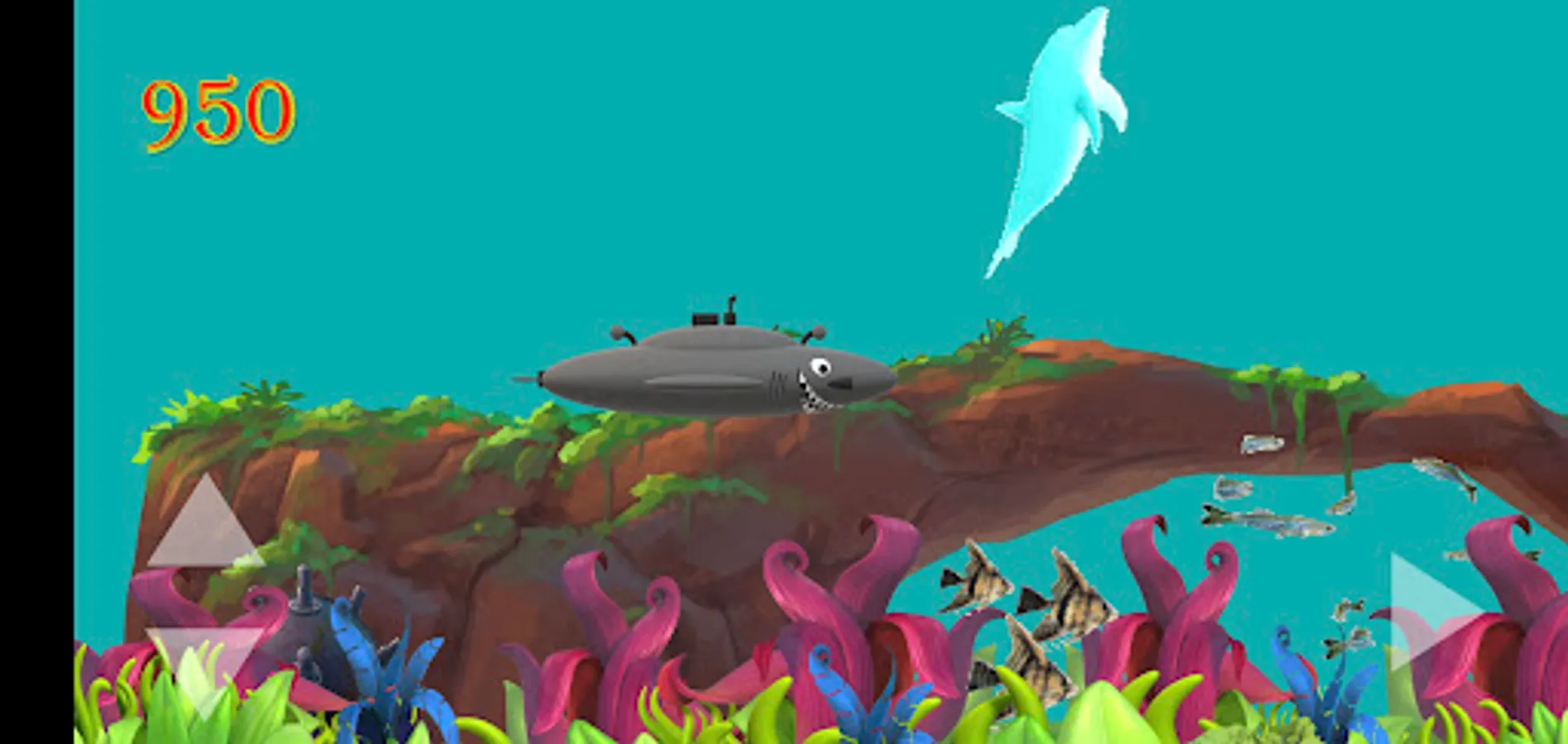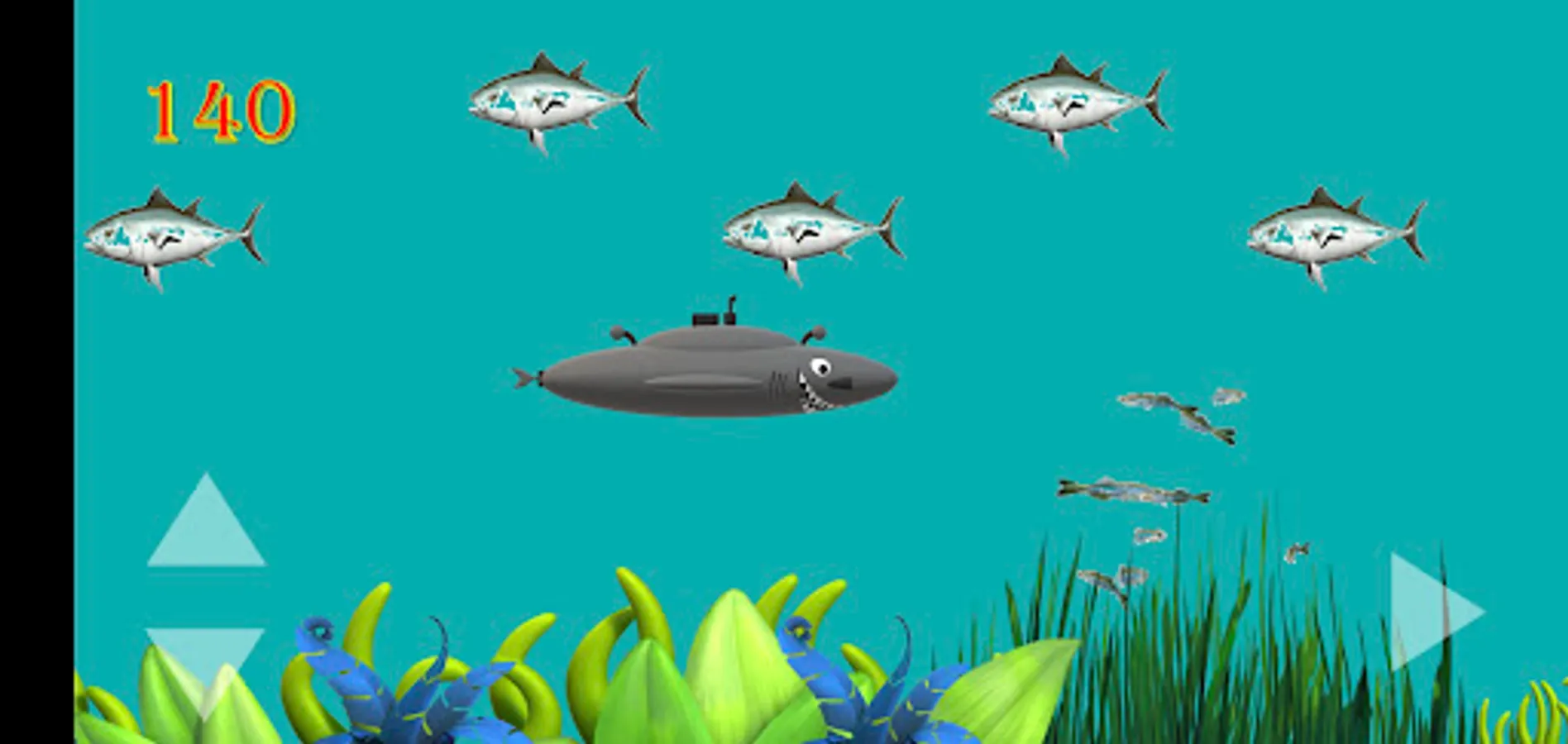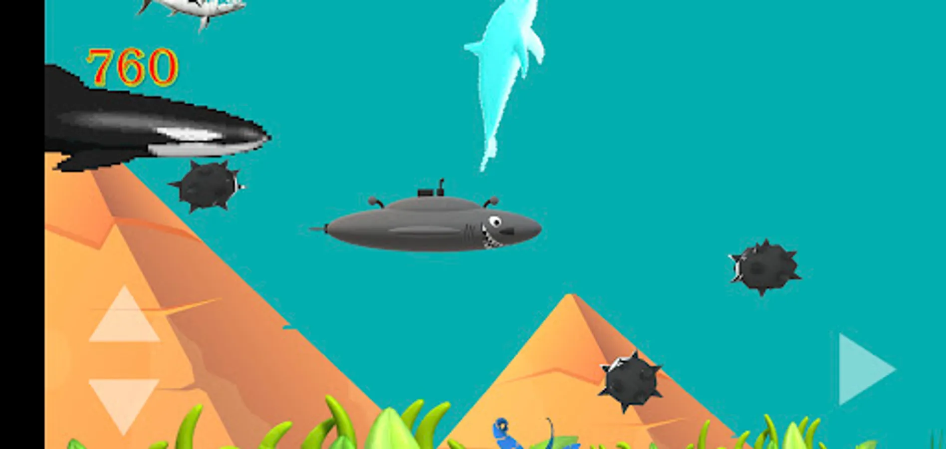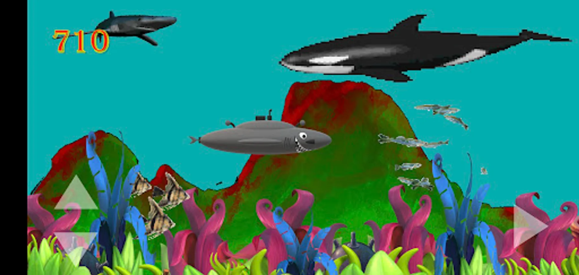 Adventure your shark sub through the Bermuda Triangle in the colorful and beautiful reef. Collect as many fish and school of fish as you can to add up your points, but remember you have to dodge the sharks, the killer whales, the wild dolphins and the sea mines as these will kill you. There are bonus points to collect if you see the blue dolphin.