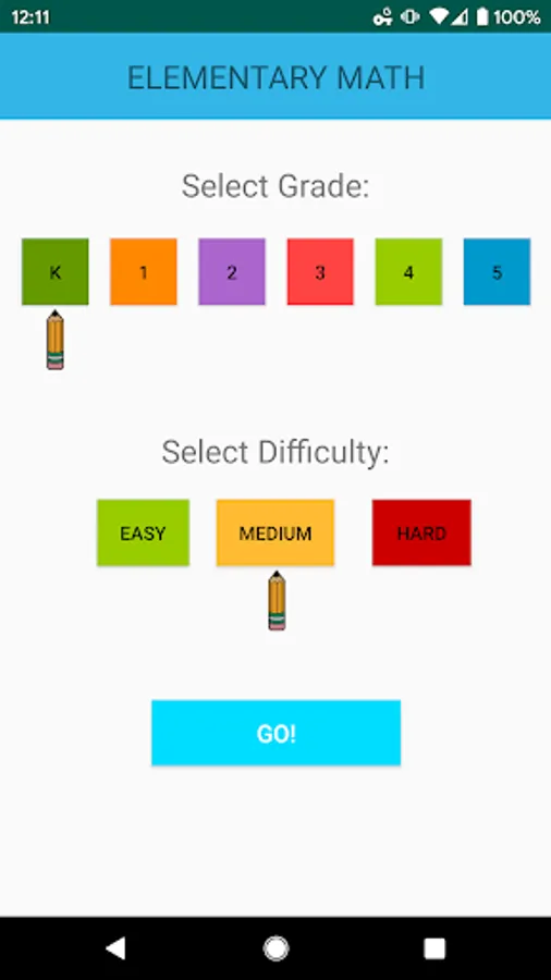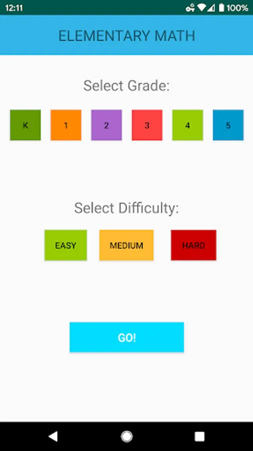 Elementary Math was created to assist parents and teachers in teaching their kids elementary-level math. This app was designed for K-5 (Elementary/Primary School) level students and includes an "easy", "medium", and "hard" difficulty for each grade level.