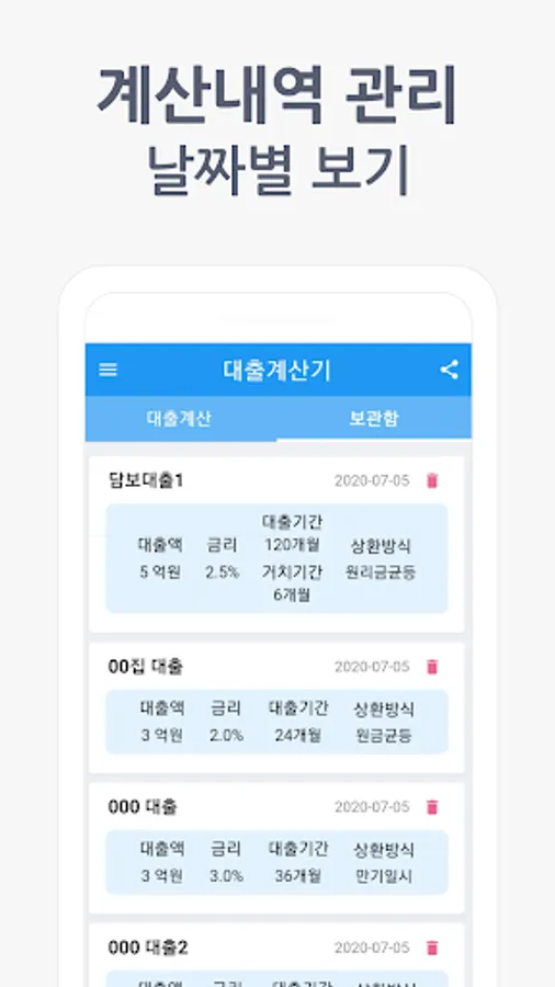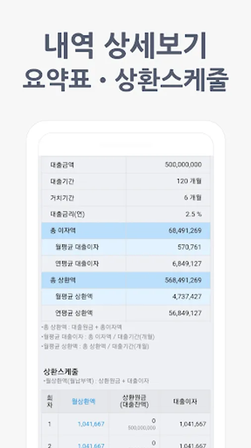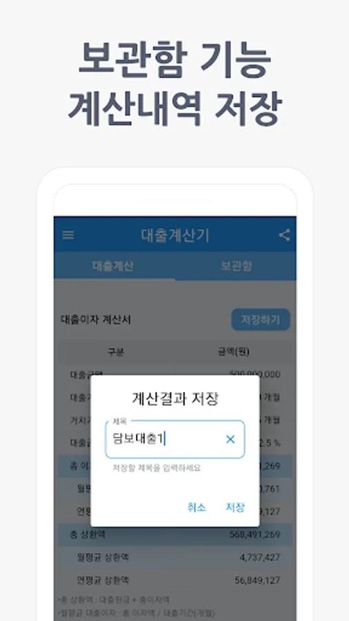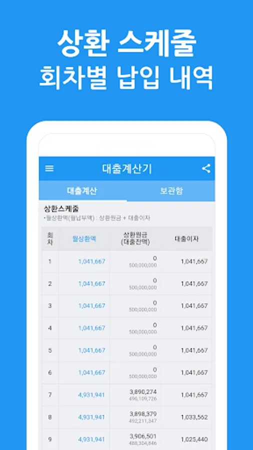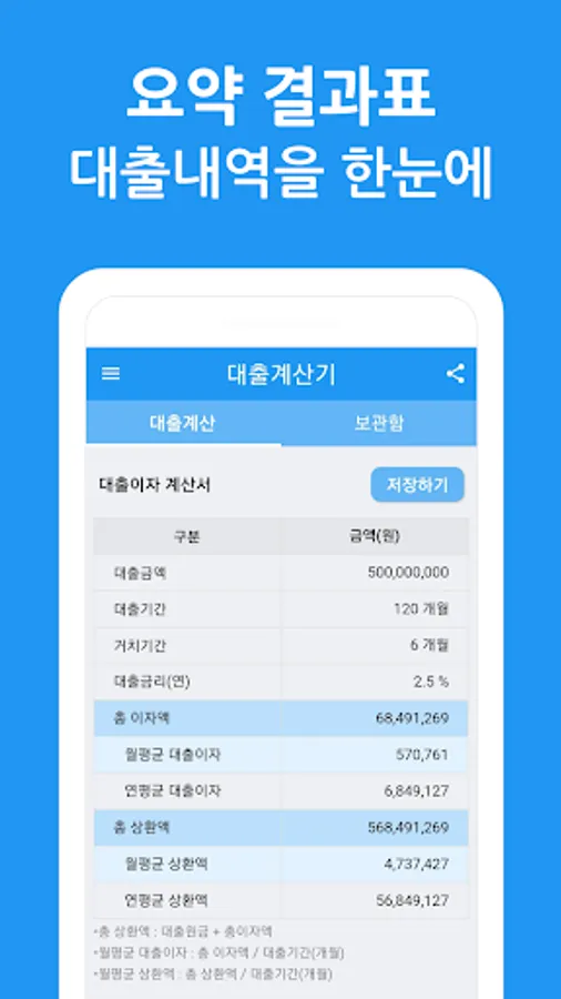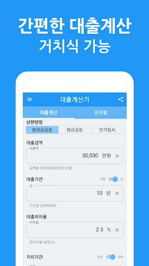 거치기간 설정 가능, 상환스케쥴표 생성, 계산결과 저장기능