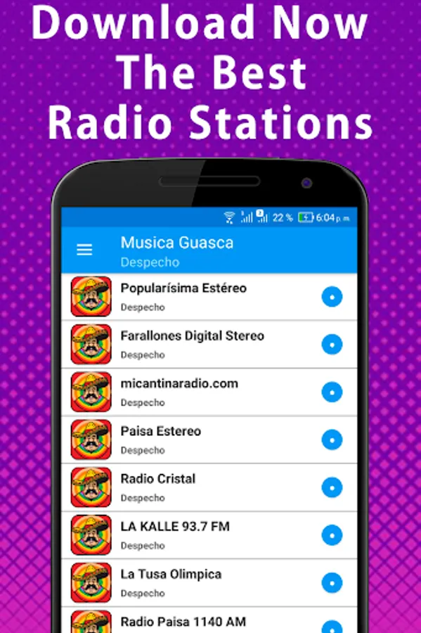It is a musical genre that many people listen to in Colombia, especially in the department of Antioquia and in the coffee belt. With this guasca or track music app you will be able to find programming: old track music, popular music, ranchera music, Colombian popular music, guascarrilera music videos, guascarrilera music to listen, promotions success, guasca parrandera music, guasca music by Dario Gomez, varied music guasca, music lane las gaviotas, guasca pueberina music, among others.
