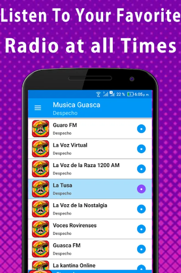 The radio stations that you will find in this App are specialized in transmitting songs of guasca or lanes, since its content is focused on this genre in most of its programming. In them you can listen to informative locutions about your favorite artists and groups (their history, tours and concerts, news and novelties, releases, new successes, etc.)