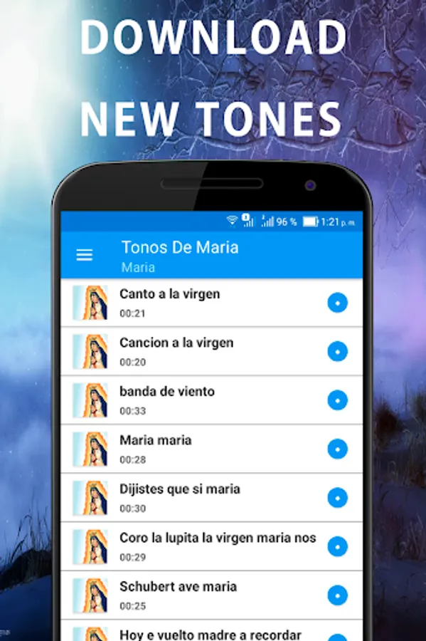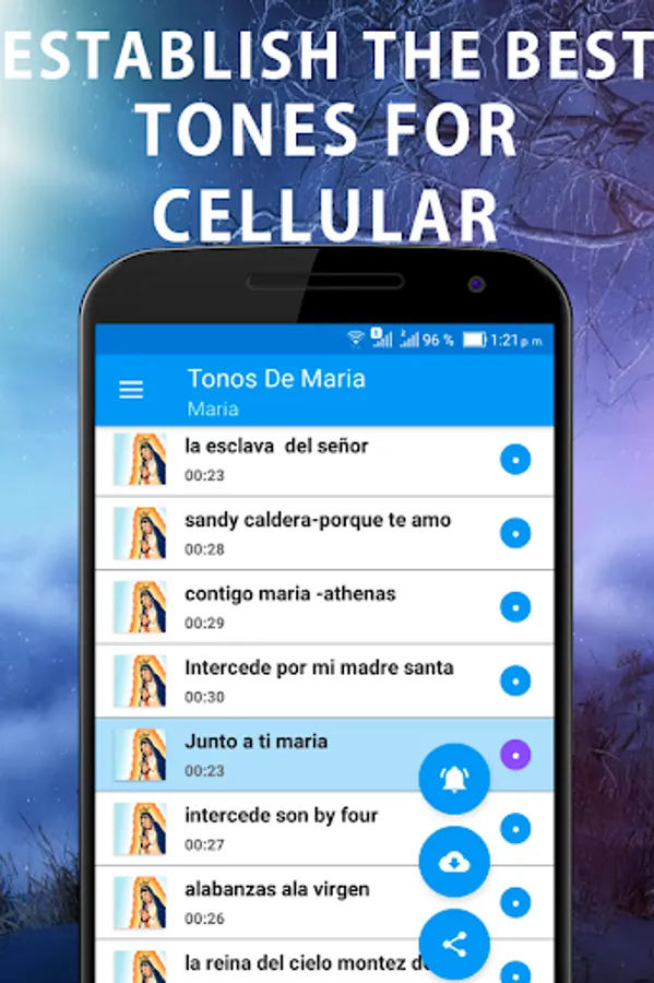 Download the best singing tones to the mother of Jesus of Nazareth for your cell phone in this application of rigtones where you will find the best of music songs to the Virgin for your calls, free songs of healing music tones for my cell phone, ringtones Vowels To The Virgin, in this Application you will find Christian ringtones download Christian tones praises Maria for the mobile, new songs canticones for the free cellular for calls.