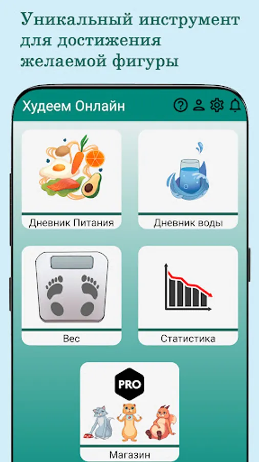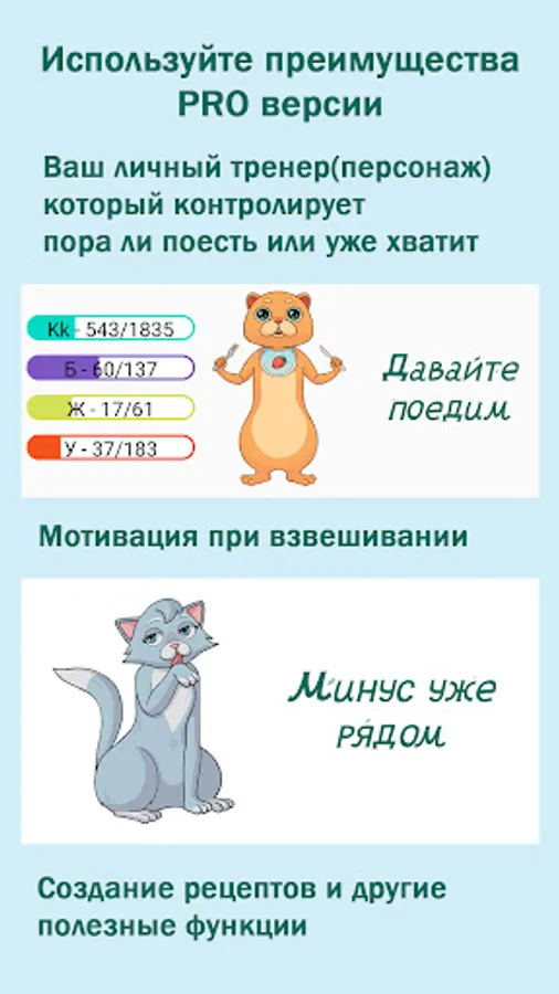 The application has collected important elements that allow you to lose weight correctly, contains unique tools that will help you achieve not only results, but also do it with great pleasure: