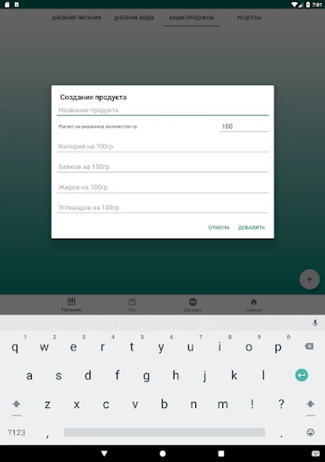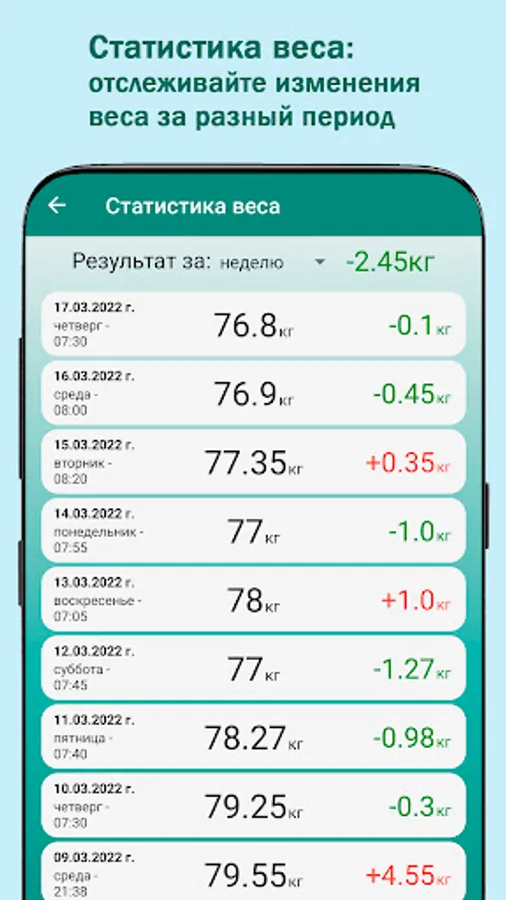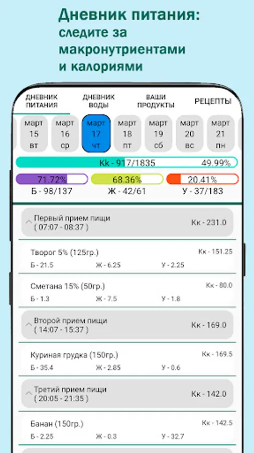 – Statistics (graphs) on weight loss / water balance / KBJU norms