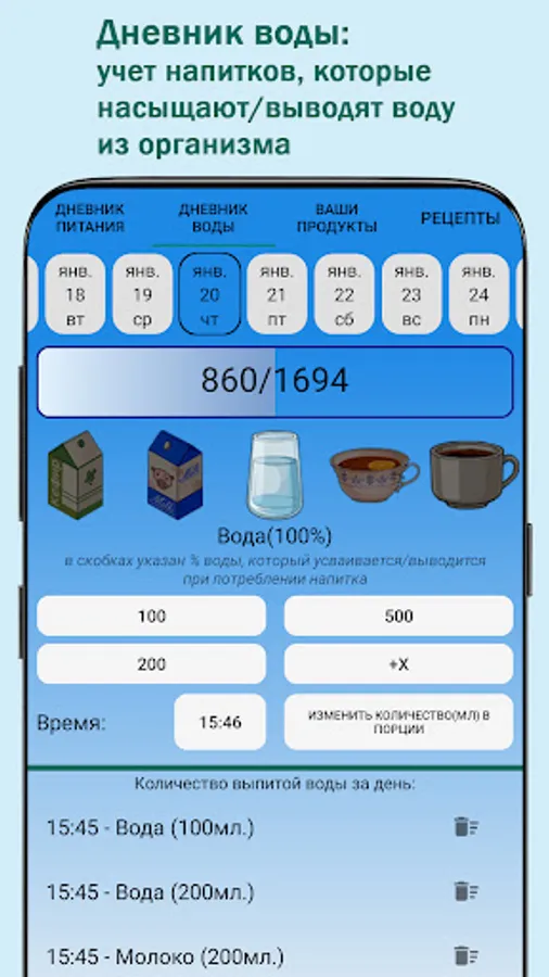 – All drinks that allow you to automatically calculate the absorption / removal of water from the body in the "Water Diary"