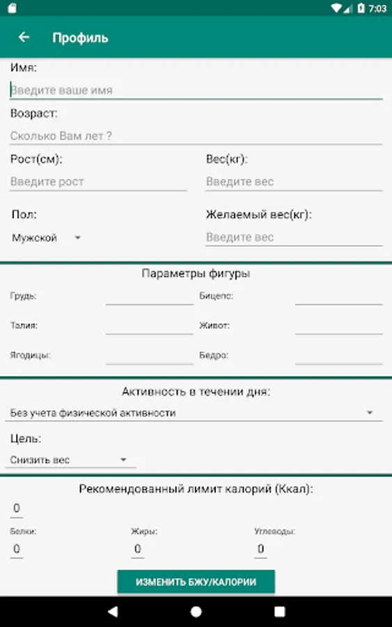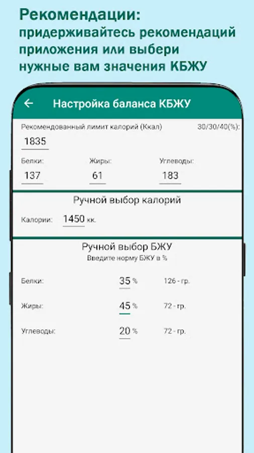 – Recommendations on the norm of KBZhU and water, regarding your parameters, activity and goal