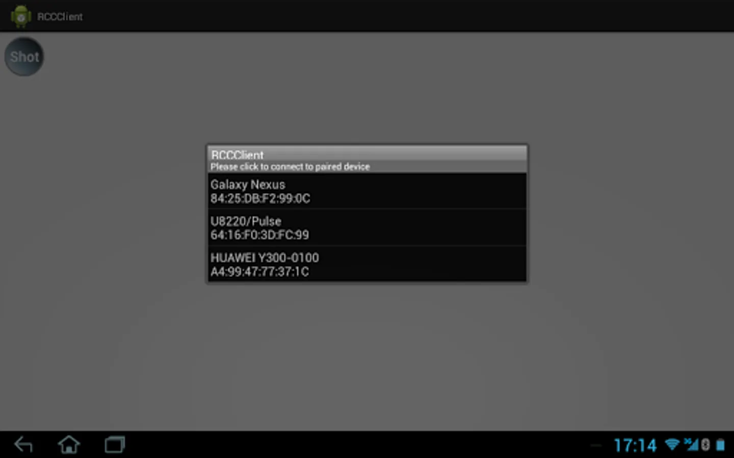 RCCClient is a client to remote control RCCDroid Pro via Bluetooth. So a wireless shutter release is possible. Taken pictures will be transferred as thumbnail to client.