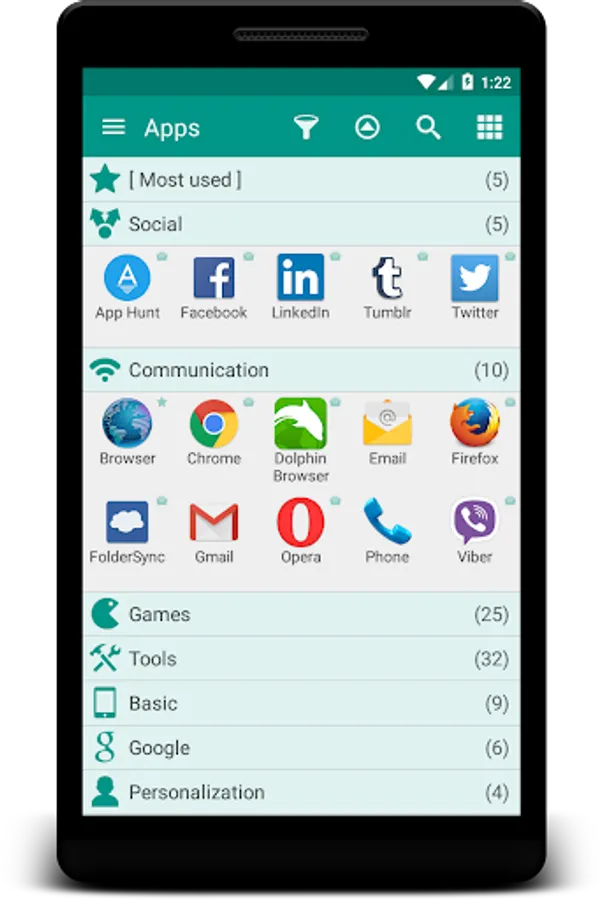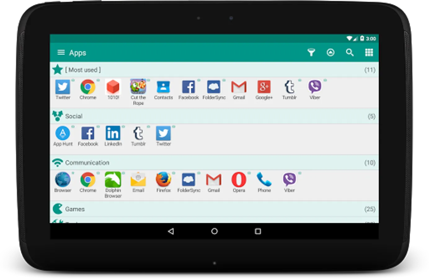Organize your applications with auto-grouping to folders feature which is based on Google Play categories. Newly installed applications can be categorized automatically. If you want to get more personalized structure, create your own folders or just rename predefined ones. It is possible to assign each application to several groups at the same time according to your needs. Use system folders to get quick access to most used, last used, or last installed apps.