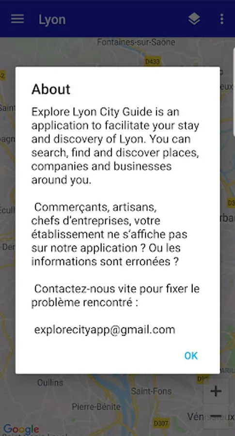 Since Explore Lyon is a "Find Places Around Me" mobile application, you should use it while visiting Lyon. If you want to try it from your current location, you can always install a "Fake GPS" app and setup your new location in the city of Lyon.
