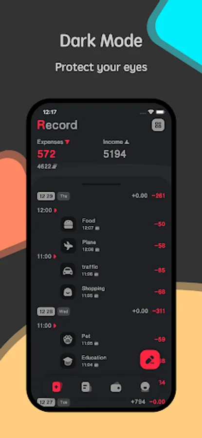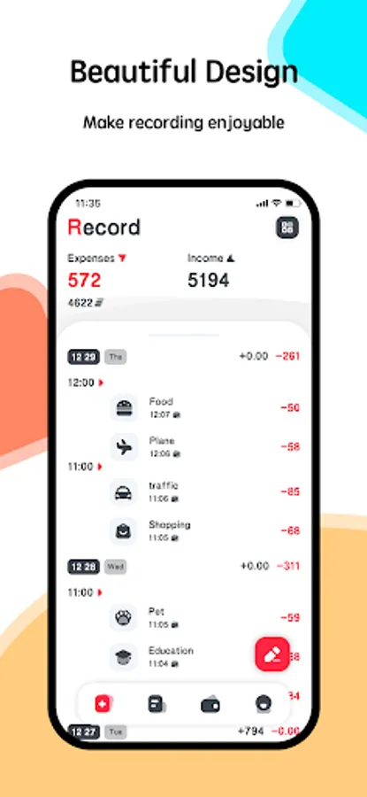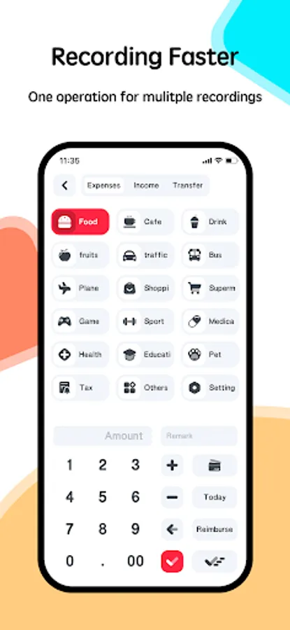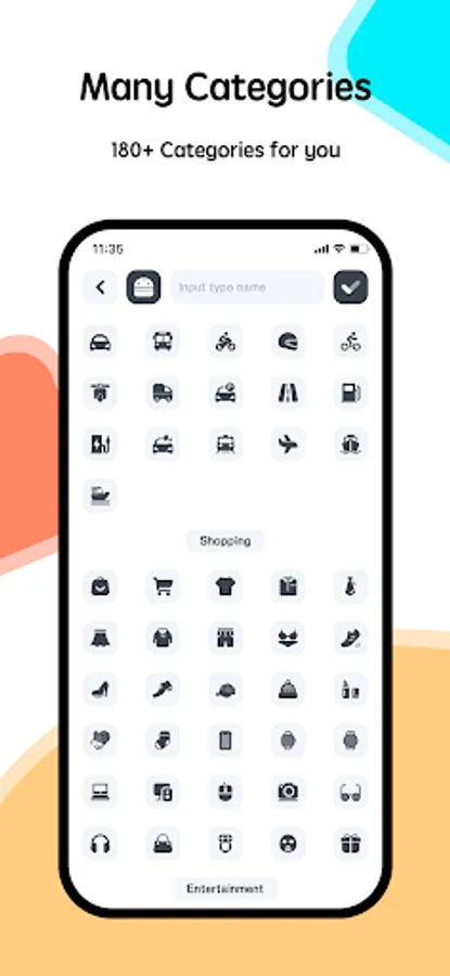 Elephant money manager has various record type, including food, bills, transportation, car, entertainment, shopping, clothing, insurance, tax, telephone, smoke, health, pet, beauty, vegetables, education, salary, awards, sale, refunds, investments, dividends etc.