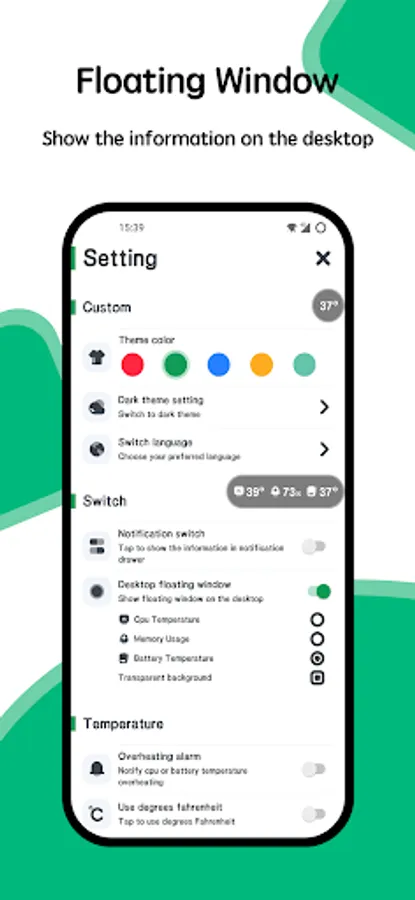 Floating window show the cpu temperature, battery temperature, ram usage real time